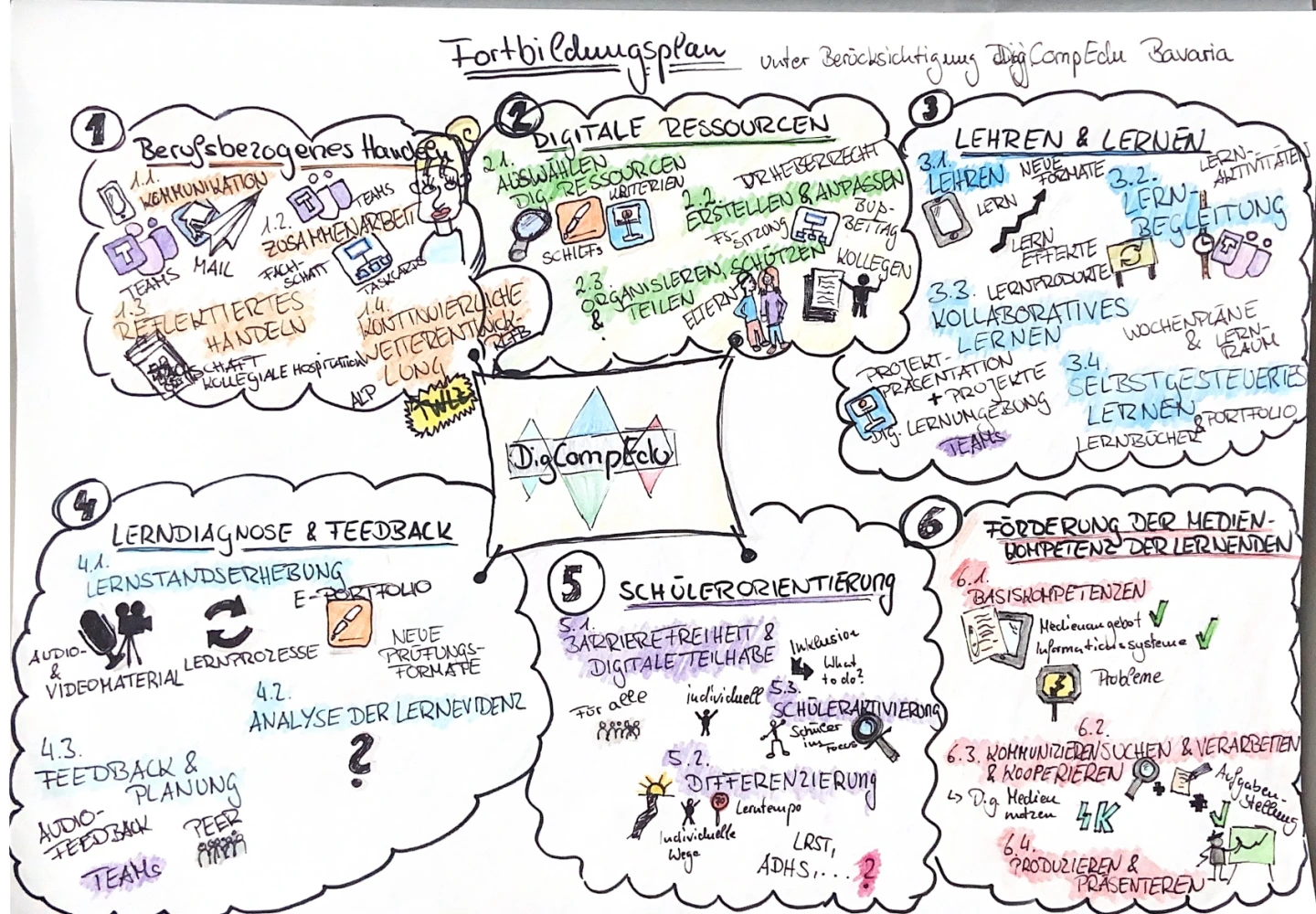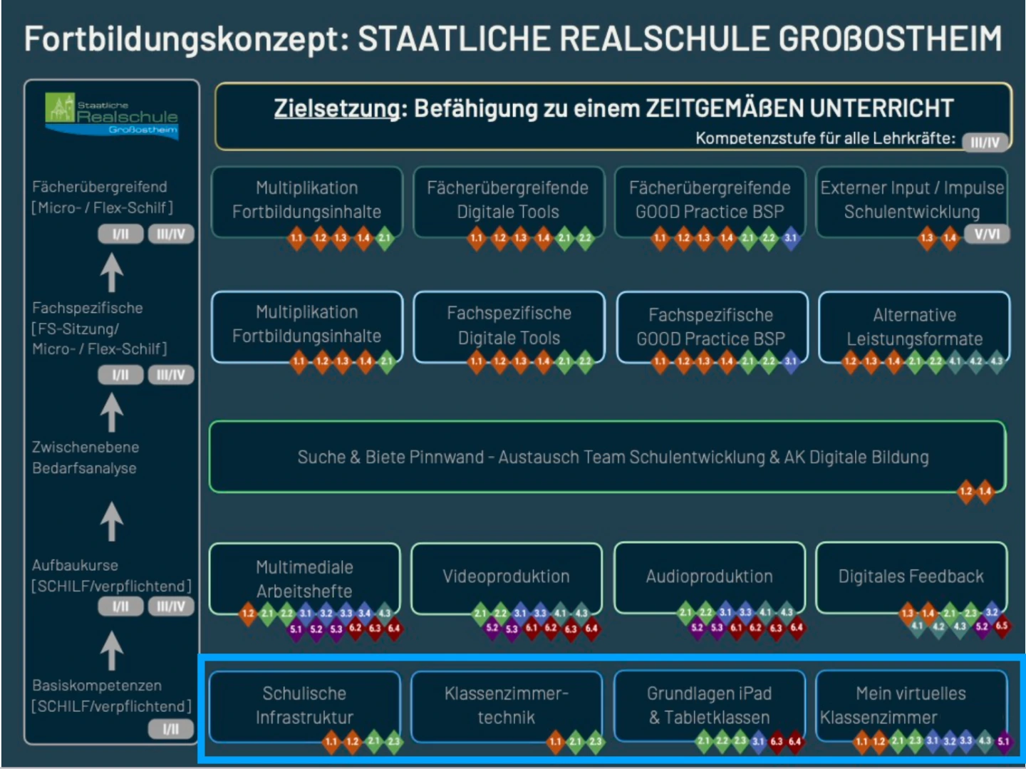 Nach der Festsetzung des Entwicklungsziels „selbstgesteuertes Lernen“ diente der DigCompEDU Bavaria als Tool, um Schwerpunkte für die Fortbildungsplanung zu definieren. In diesen Schwerpunktthemen sollen die Lehrkräfte, nach dem Erwerb von Basiskompetenzen, in Aufbaukursen geschult werden. In allen Bereichen soll das Kollegium die Niveaustufe III/IV erreichen.