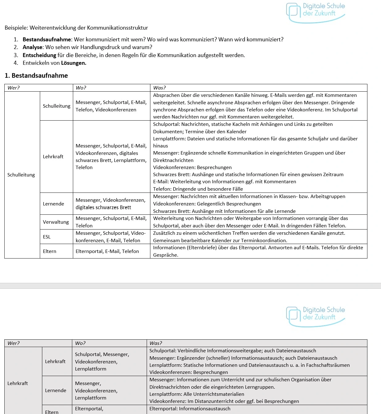 Eine sorgfältig durchdachte digitale Kommunikationsstruktur innerhalb der Schulfamilie eröffnet bedeutende Potenziale für eine erfolgreiche Zusammenarbeit. Klare Absprachen sind unerlässlich, um diese Chancen optimal zu nutzen. Eine Analyse darüber, wer welche Kommunikationskanäle zu welchem Zweck nutzt, ist notwendig, um mögliche Verbesserungen zu identifizieren. Diese Analyse soll ebenfalls aufzeigen, an welchen Stellen (weitere) Absprachen erforderlich sind.