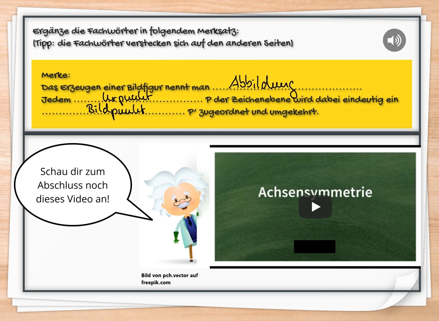 Als Abschluss der Erarbeitungsphase empfiehlt es sich, einen Merksatz festhalten zu lassen und bei Bedarf ein Erklärvideo zu den Grundlagen des zu erarbeitenden Inhalts anzuhängen.