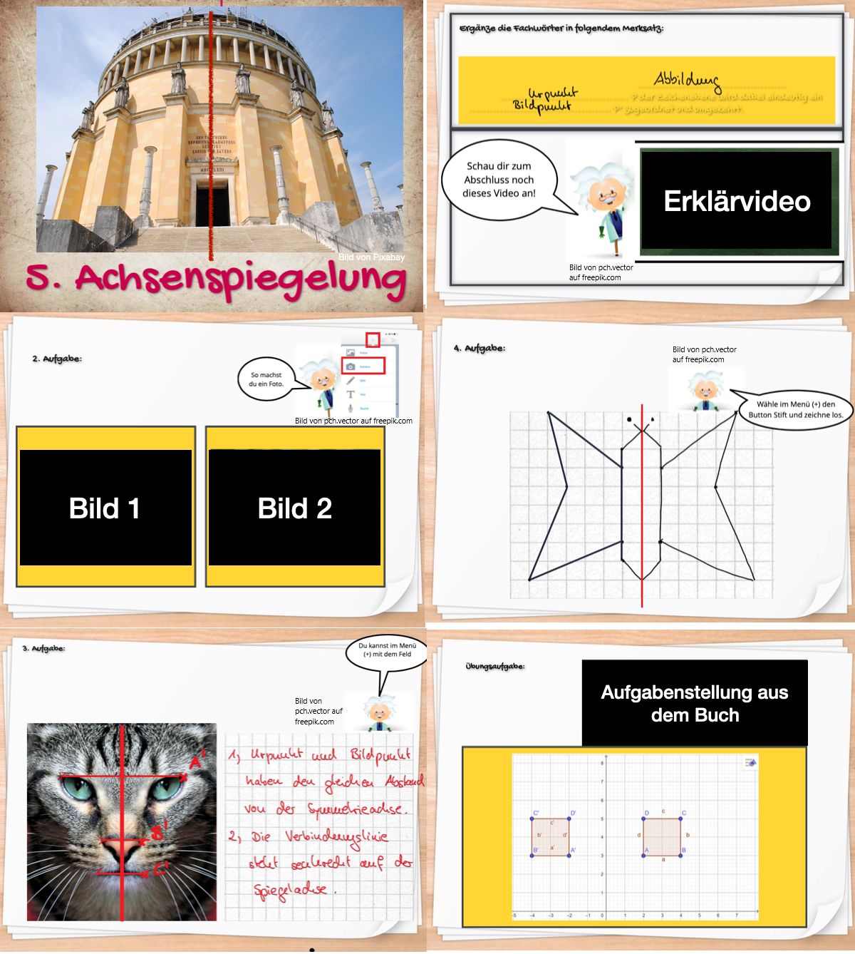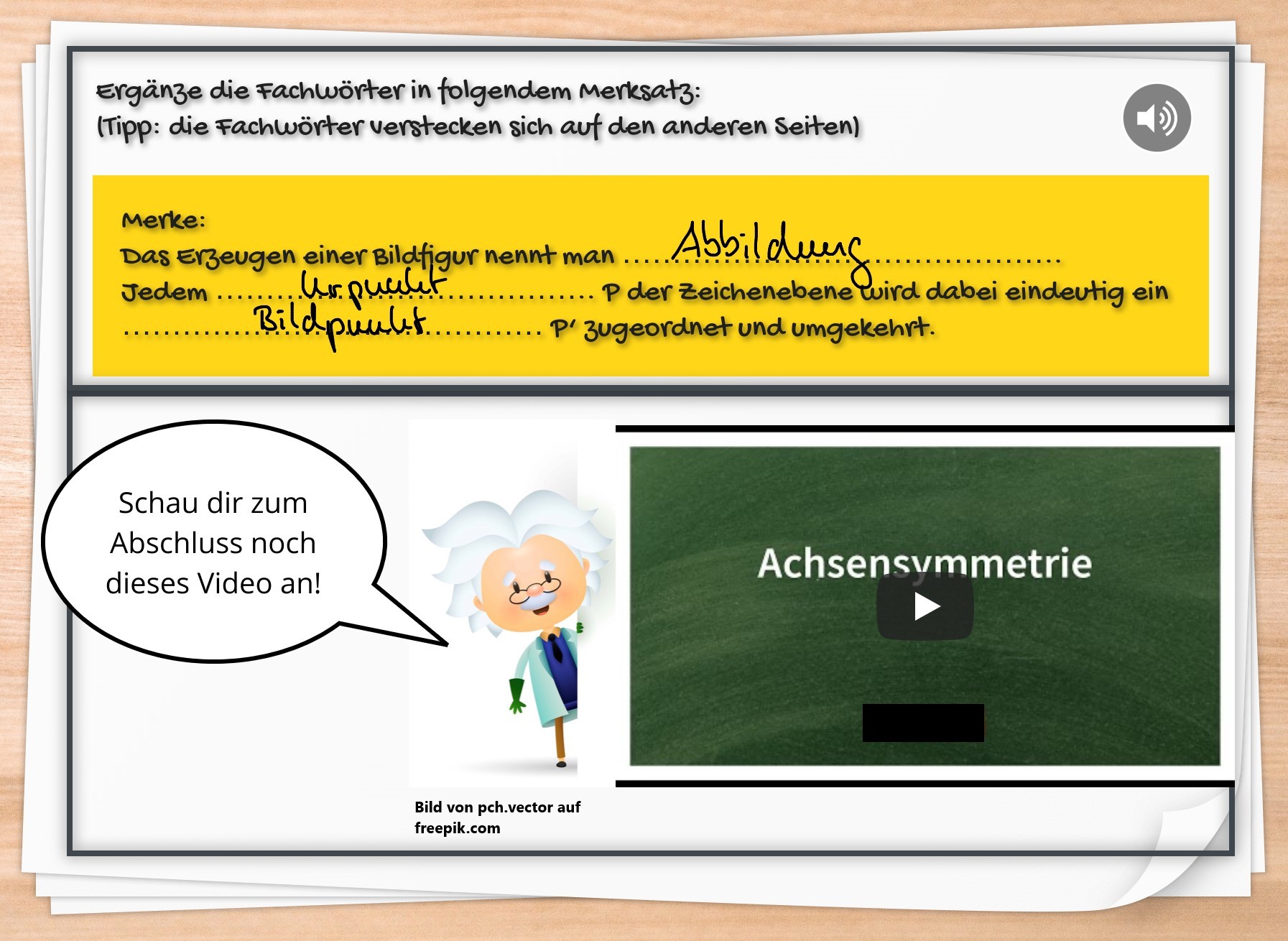 Zur Erarbeitung der Achsenspiegelung blättern die Schülerinnen und Schüler nacheinander die Seiten der E-Books durch. Eine Differenzierung ist in den verschiedenen Apps meist einfach umzusetzen, z. B. durch das Einfügen von Erklärvideos.