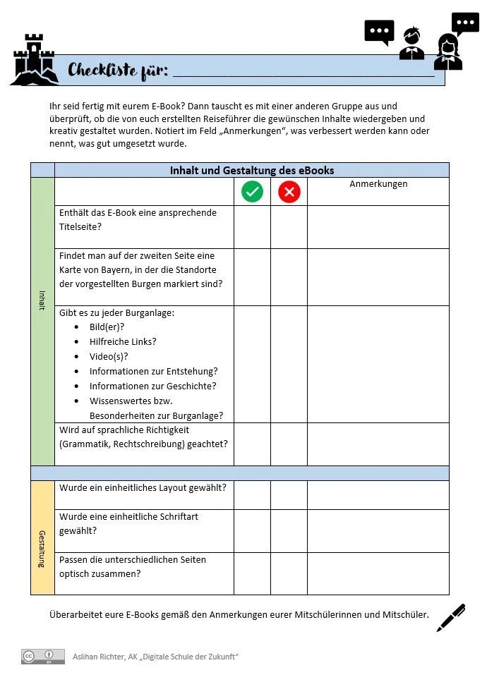 Anhand einer Checkliste werden die fertigen E-Books der Mitschülerinnen und Mitschüler überprüft. Lernende erhalten Anregungen für eine Überarbeitung ihres „Reiseführers“.