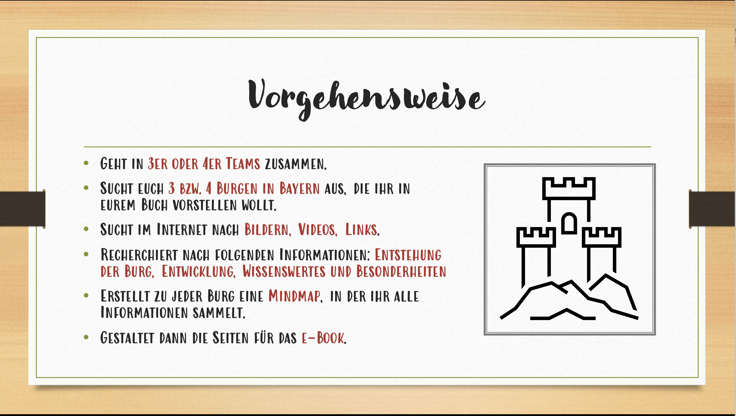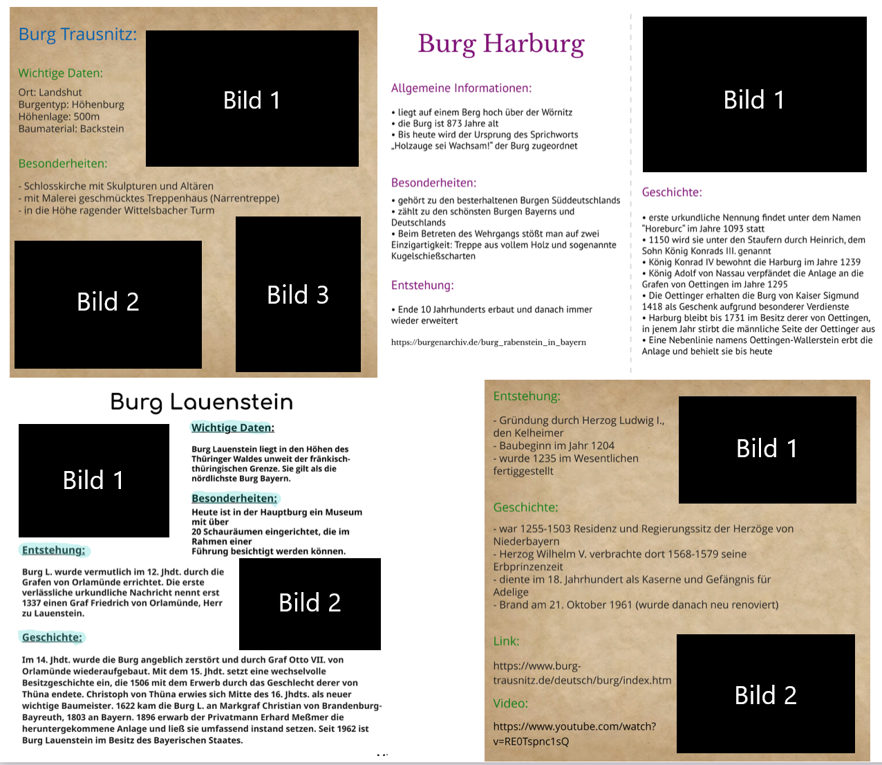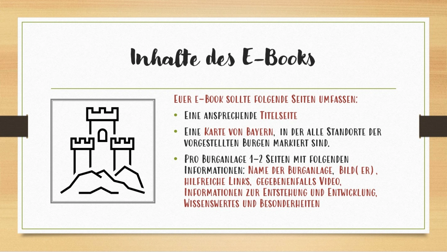 Außerdem hat es sich als hilfreich herausgestellt, wenn den Lernenden, v. a. in den unteren Jahrgangsstufen, genau vorgegeben wird, welche Inhalte verlangt werden (Bilder, Videos, Links, Informationen zur Entstehung und Geschichte der Burg, Besonderheiten, …).