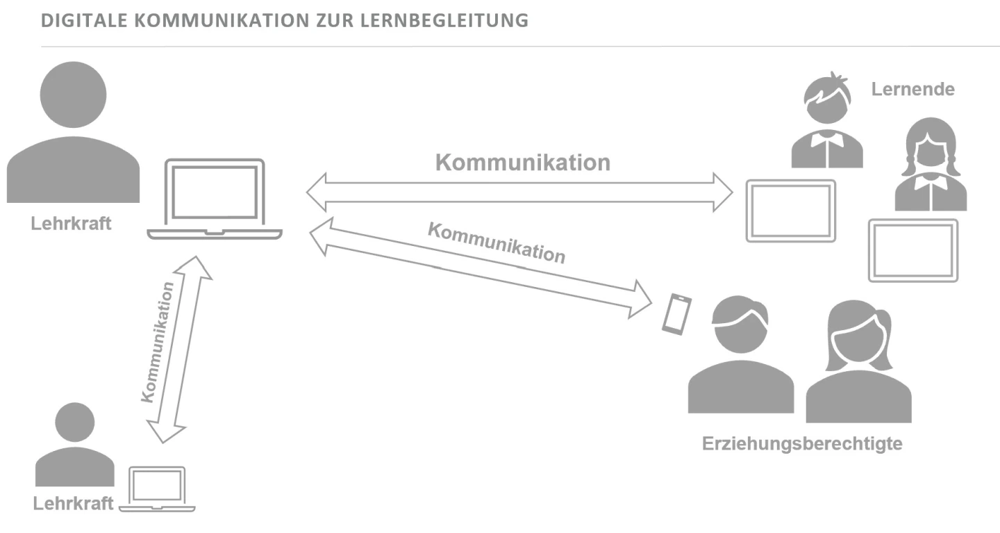 Im 1:1-Setting sind im Normalfall die technischen Möglichkeiten gegeben, damit eine (verbindliche) digitale Kommunikation auch zwischen Lernenden und Lehrenden erfolgen kann. Die Lehrkräfte müssen soweit technisch geschult werden, damit eine Begleitung ihrer Lernenden möglich ist. Zudem ist es sinnvoll, Unterstützungssysteme technischer und medienpädagogischer Art zu etablieren. Auch um der Erwartungshaltung einer ständigen Verfügbarkeit vorzubeugen, sollten grundlegende Regeln vereinbart und eingefordert werden.