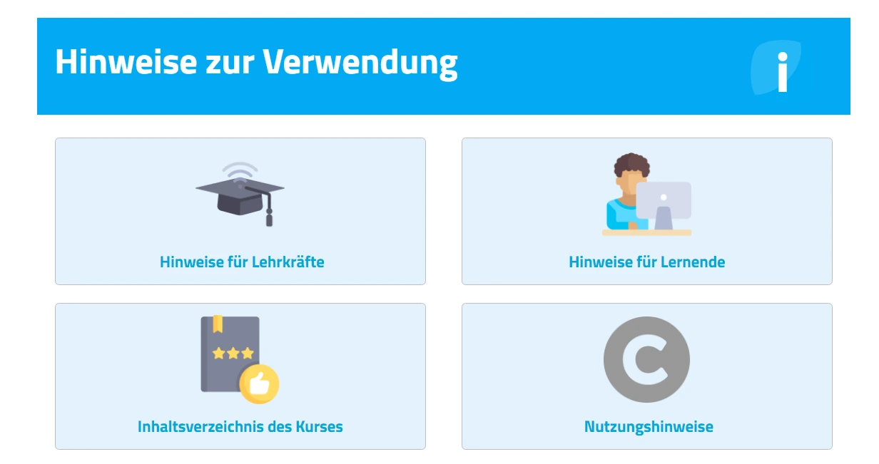 Für die vollständige Nutzung des Kurses und der Verlinkungen ist eine Genehmigung der Schulleitung notwendig, dass den Schülerinnen und Schülern Werbung gezeigt werden darf, da einige verlinkte Seiten werbungsfinanziert sind. Die Vorlage für ein entsprechendes Formular sowie weitere schul- und urheberrechtliche Vorgaben finden Sie im Bereich „Nutzungshinweise“.