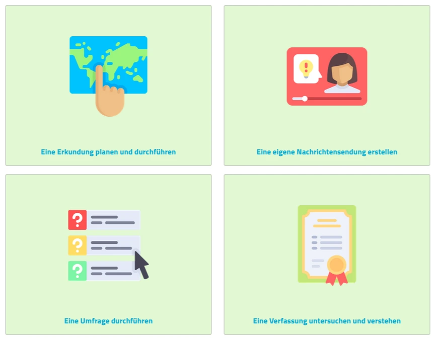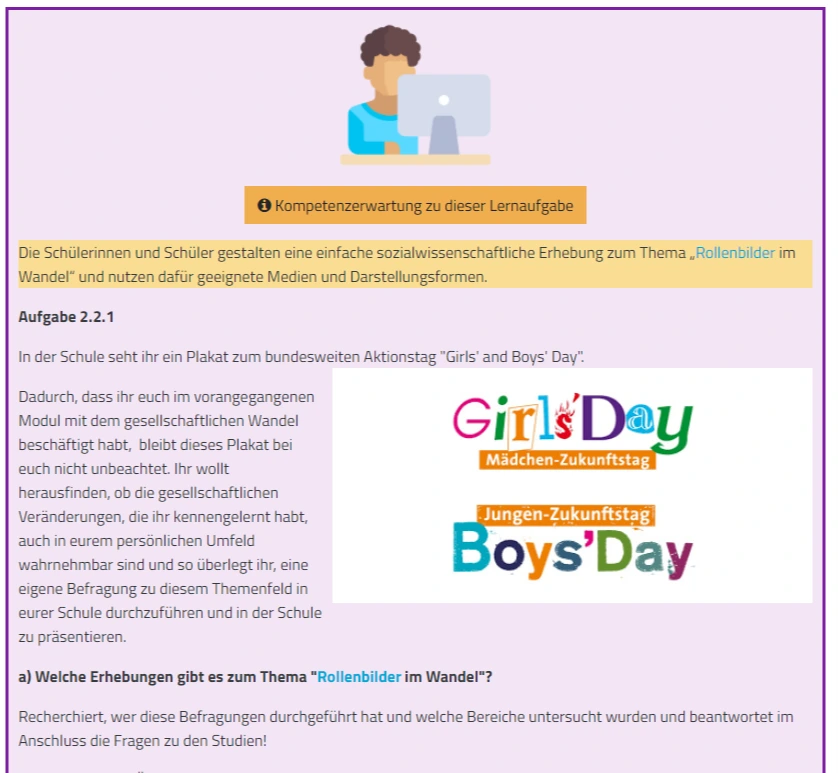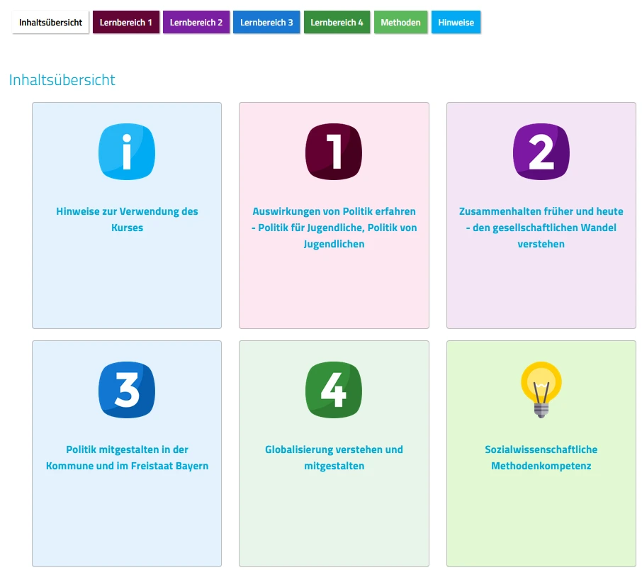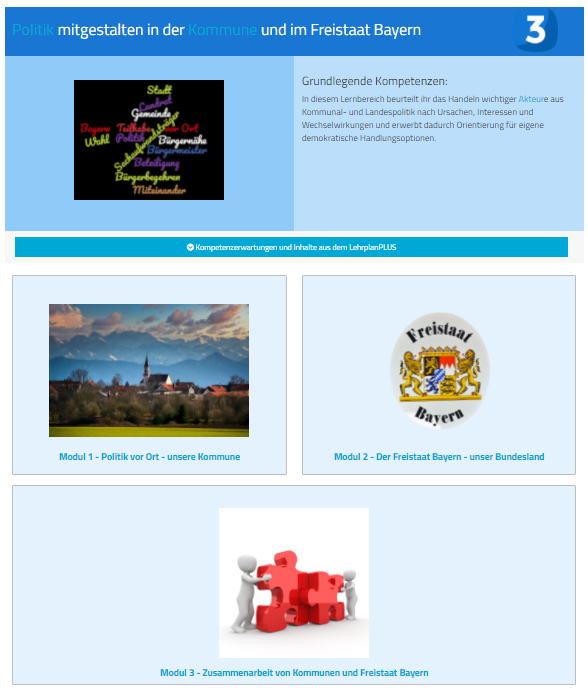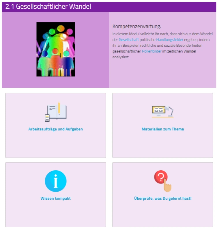 Jeder Lernbereich gliedert sich in 3-5 Module, in denen sich die Lernenden mit unterschiedlichen Schwerpunktthemen, wie z. B. „Mitwirkungsmöglichkeiten Jugendlicher“ auseinandersetzen. Die Module folgen ebenfalls einem einheitlichen Aufbau, der auf der Modulauftaktseite deutlich wird: Neben der auf die Perspektive der Lernenden zugeschnittenen Kompetenzerwartungen bietet ein thematisch passendes Bild eine erste Einstiegsmöglichkeit in den zu behandelnden Themenkomplex. Die „Arbeitsaufträge und Aufgaben“ veranschaulichen, wie die Inhalte und Kompetenzerwartungen ganz konkret in der unterrichtlichen Praxis umgesetzt werden können und binden altersgerechte sowie ansprechende Materialien direkt oder als Verlinkung in den Lernprozess ein. Ergänzend wird Ihnen eine Vielzahl dieser Materialien im Bereich „Materialien zum Thema“ zur individuellen Nutzung bereitgestellt.