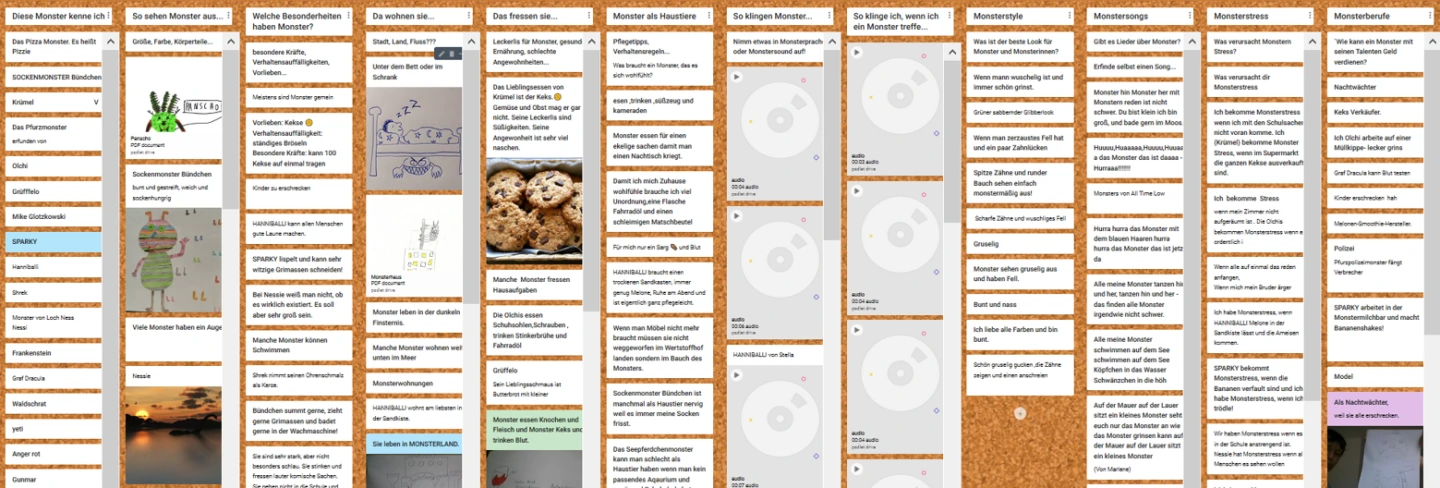 Eine Grundschulklasse erstellt gemeinsam ein digitales Sachbuch zum Thema Monster. Je nach IT-Infrastruktur der Schule sowie Vorerfahrung der Lehrkraft und der einzelnen Lernenden bietet die Digitale Lernaufgabe verschiedene Variationsmöglichkeiten: Das Brainstorming (Wie sehen Monster aus? Wie hören sie sich an? usw.) könnte in Form einer digitalen Pinnwand gemeinsam oder in Papierform in Einzelarbeit stattfinden. Das Erstellen von Bildern könnte mithilfe einer Zeichen-/Grafikapp oder auf Papier umgesetzt werden. Auch beim Endprodukt könnte sowohl ein E-Book-Editor gemeinsam mit der Lerngruppe eingesetzt werden oder die Endredaktion allein durch die Lehrkraft in Form eines PDF-Dokuments erfolgen.