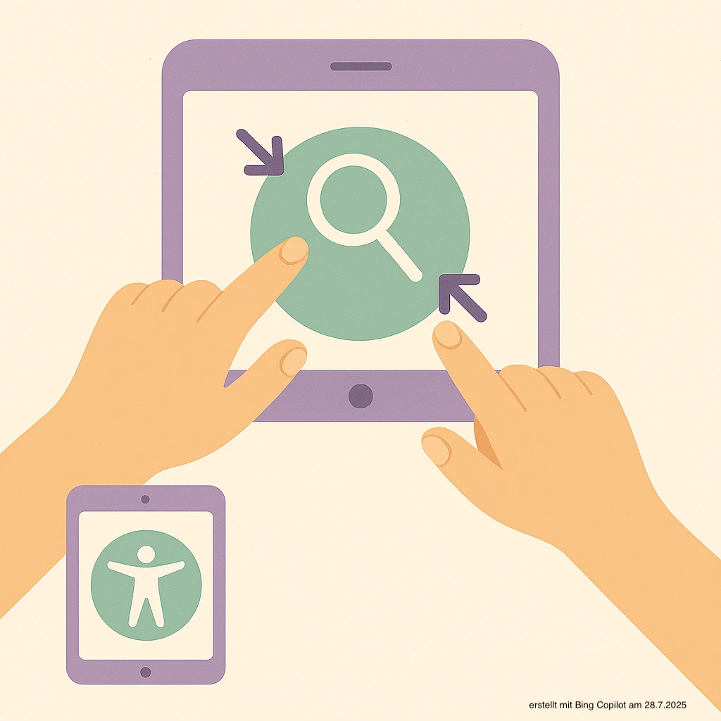 Die Zoom-Funktion auf mobilen Endgeräten ermöglicht eine vergrößerte Darstellung von Inhalten auf dem Bildschirm, um Details besser erkennen zu können. Sie unterstützt vor allem Menschen mit Sehbeeinträchtigungen beim Lesen und Bedienen des Geräts, kann aber auch den Fokus auf einen bestimmten Inhaltsteil legen.
