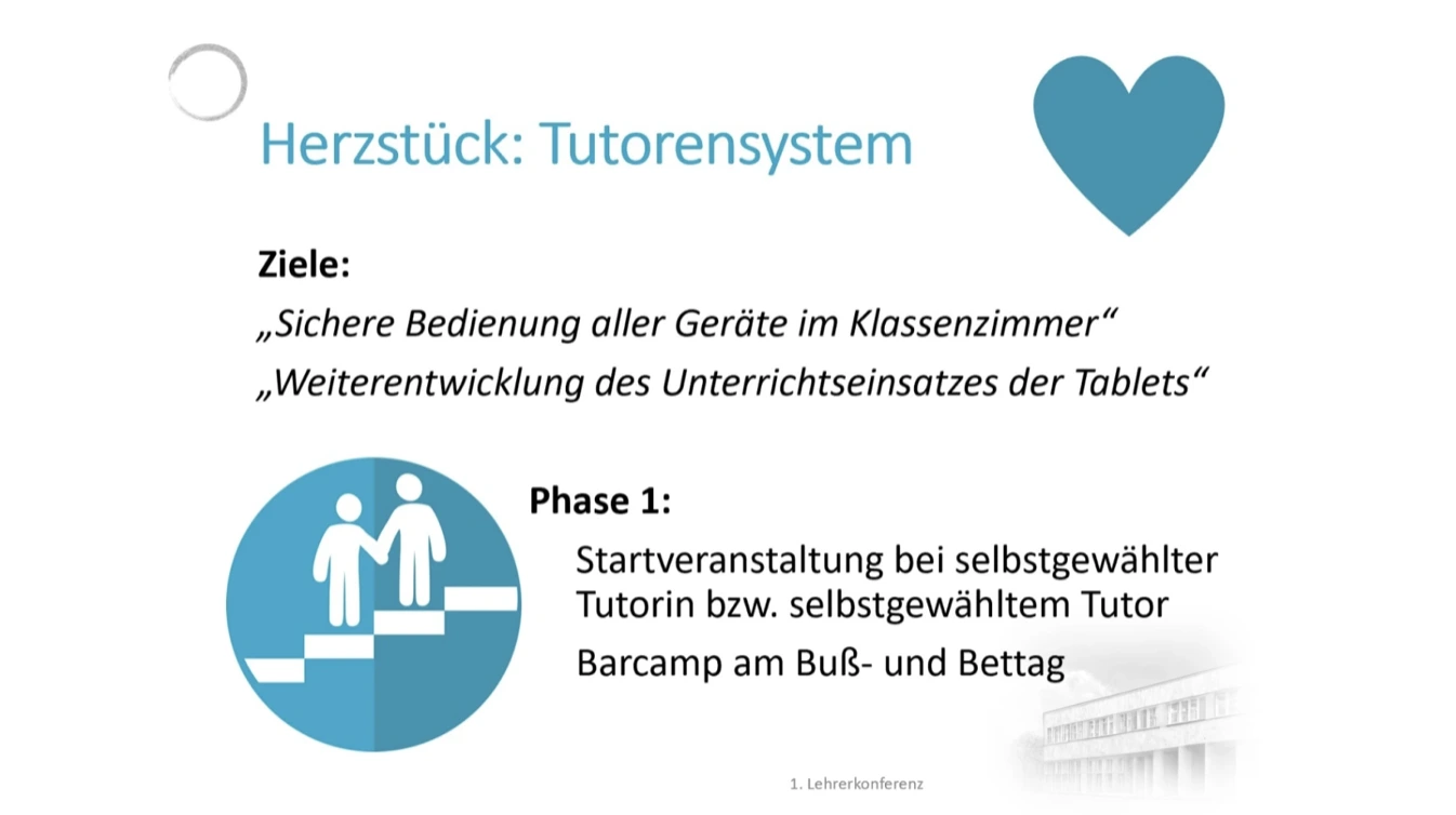 In der Lehrerkonferenz zum Schuljahresbeginn werden von der Schulleitung die mit einer Steuergruppe erarbeiteten Rahmenbedingungen zur Arbeit in den 1:1-Klassen vorgestellt:
