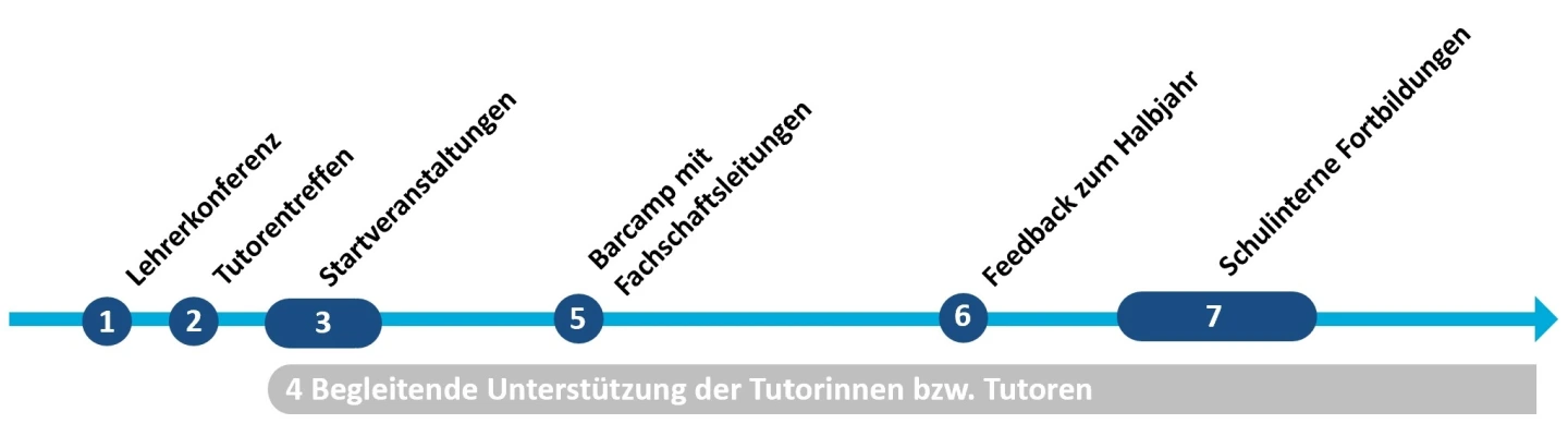 Lehrkräfte stellen sich freiwillig als Tutorinnen und Tutoren zur Verfügung. Auftakt bildet eine Besprechung mit Schulleitung und Steuergruppe. Dort wird auch ein Terminplan für verbindliche Startveranstaltung (60 Minuten – Zeitraum von zwei Wochen) erstellt. Die Zuordnung zu den Tutorinnen bzw. Tutoren erfolgt anschließend freiwillig über die Teilnahme an der jeweiligen Startveranstaltung.