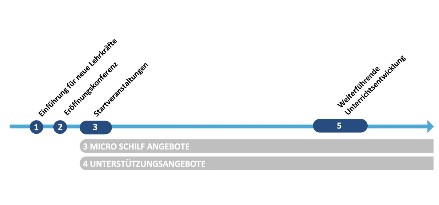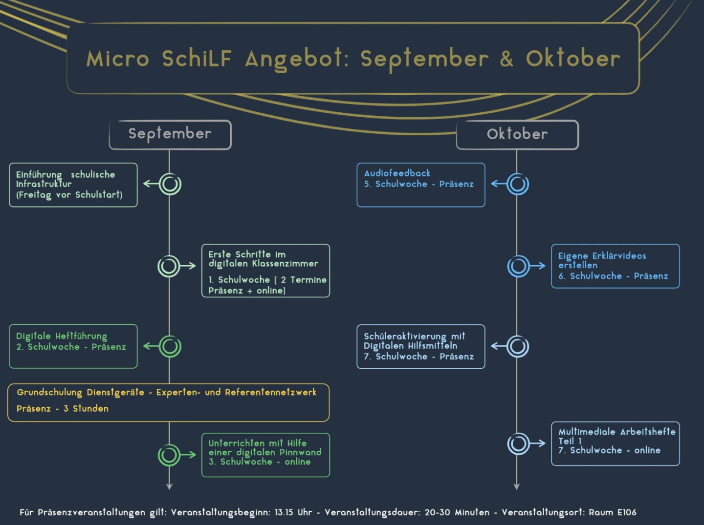 Für eine schnelle und einfache Einarbeitung von neuen und unsicheren Kolleginnen und Kollegen wird ein Micro SchiLF Konzept mit dem Angebot von Sprechstunden verbunden. Das SchiLF Angebot wird durch das Digitalteam der Schule durchgeführt und sowohl in Präsenz als auch digital abgebildet. Ausgenommen von den SchiLF Veranstaltungen ist eine Basisschulung für das Dienstgerät. Diese wird durch das Experten- und Referentennetzwerk abgedeckt.