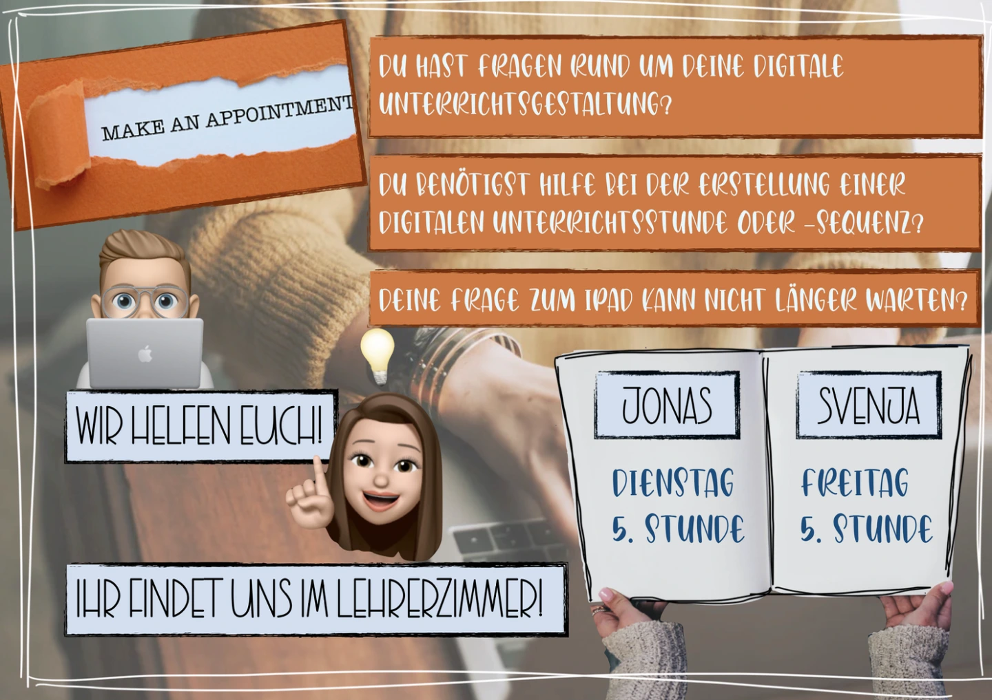 Das Medienteam und erfahrene Kolleginnen und Kollegen stehen im Unterrichtsalltag für kleine und große Fragen zur Verfügung.