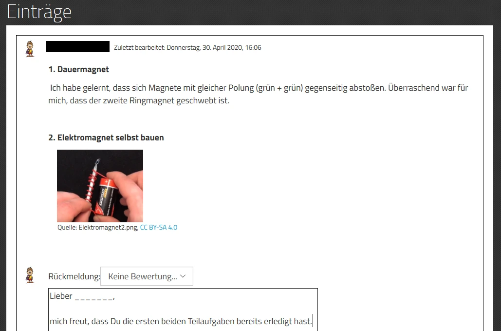 Optimalerweise begleitet die Lehrkraft durch fortlaufendes, individuelles Feedback innerhalb des Lerntagebuchs den Erarbeitungsprozess der Schülerinnen und Schüler. Dazu ist es hilfreich, wenn die Lernenden bereits Erfahrung mit Online-Feedback gesammelt haben.