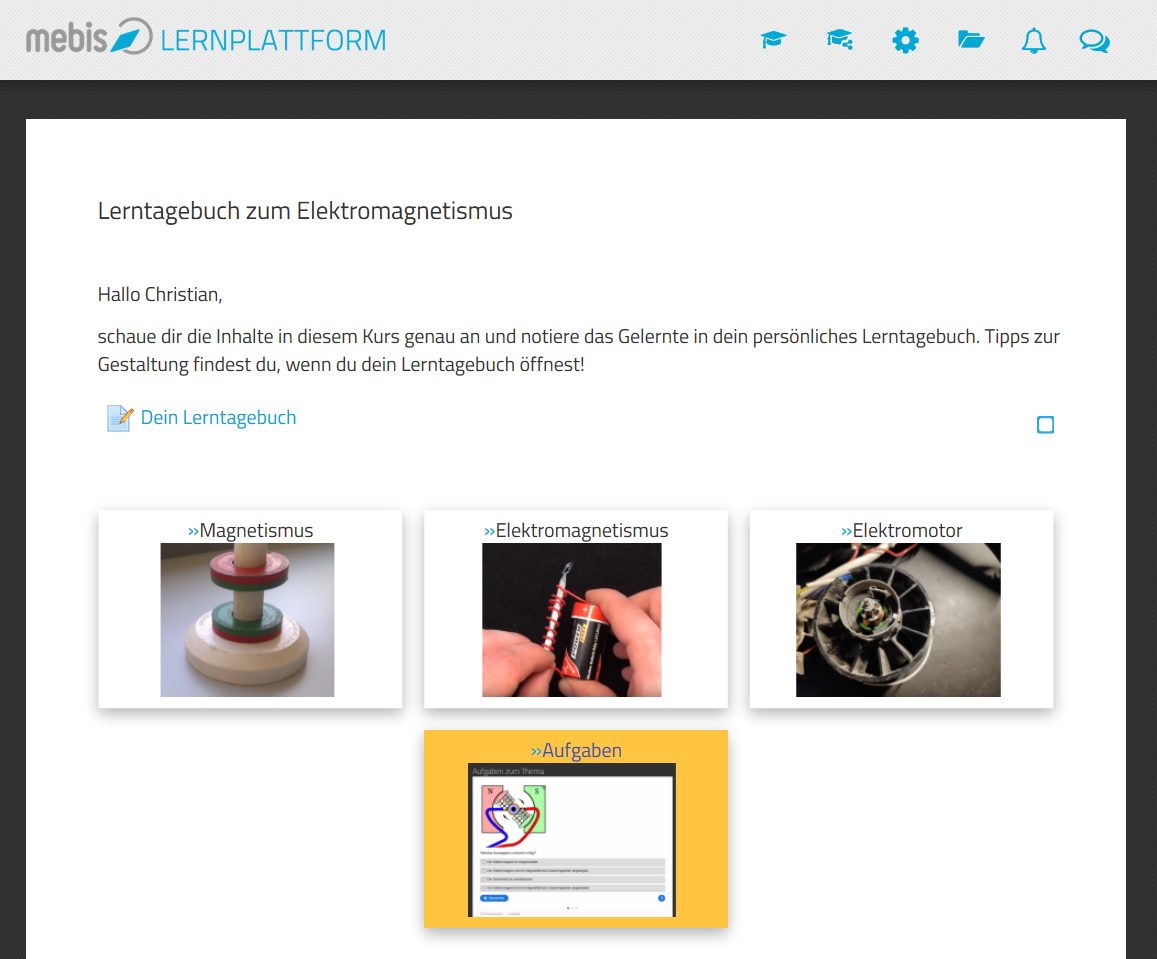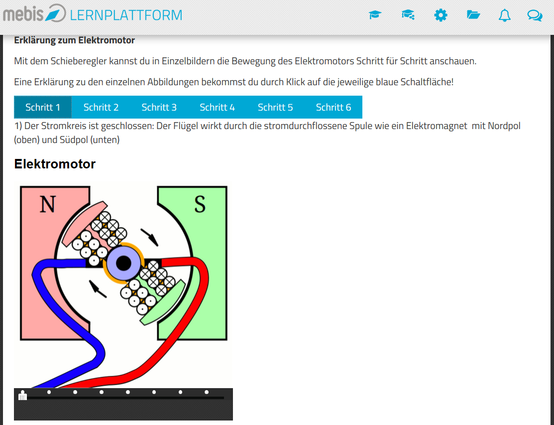 Der Kurs „Elektromagnetismus“ bietet Schülerinnen und Schülern die Möglichkeit sich selbstständig mit Hilfe verschiedener Aufgabentypen die Funktionsweise eines Elektromotors anzueignen. Verschiedene Medien (Erklärvideos, Animationen, Schritt-für-Schritt-Anleitungen) werden zielgerichtet zur Erarbeitung eingesetzt.