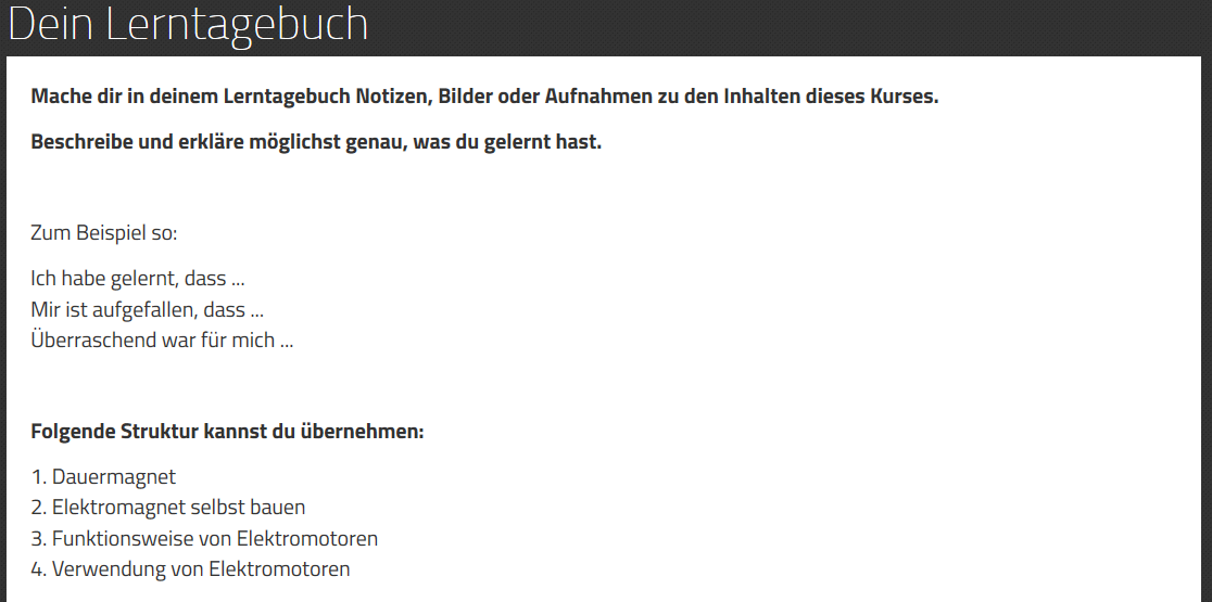 Im zweiten Block zum Thema „Elektromagnetismus“ wird in einem Videotutorial gezeigt, wie man mit Haushaltsmitteln einen einfachen Elektromagneten bauen kann. Die eigenständige Durchführung des Versuchs soll im Lerntagebuch durch die Lernenden mit einem Foto des funktionierenden Elektromagneten dokumentiert werden.
