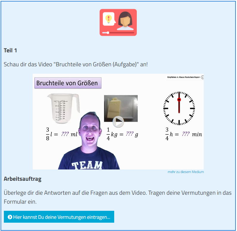 Sie können die Erklärvideos aus der Mediathek den Lernenden auf unterschiedliche Weise zugänglich machen. Grundsätzlich sollten Sie sich entscheiden, ob Sie das Erklärvideo in Kombination mit einem Arbeitsauftrag an die Lernenden weitergeben sollen, oder den Arbeitsauftrag separat stellen wollen. Unabhängig davon ist immer ein Login in der Lernplattform erforderlich.