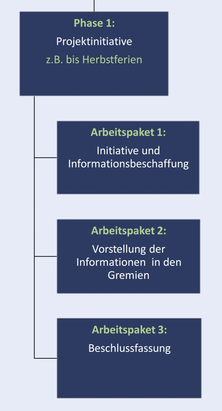 Da eine Projektdefinition bereits vorliegt, beschränkt sich die Aufgabe der Initiativgruppe auf das Sammeln der notwendigen Grundinformationen für eine passgenaue schuleigene Regelung. Die Grundinformationen wie rechtliche Aspekte, mögliche Inhalte, Erfahrungen der Versuchsschulen, werden anschließend den zuständigen Gremien (z.B. Lehrerkonferenz, Elternbeirat, SMV) präsentiert. Die Sammlung der Grundinformationen kann selbstverständlich auch durch die Schulleitung und/oder in Absprache mit einem bestehenden Schulentwicklungsteam erfolgen.