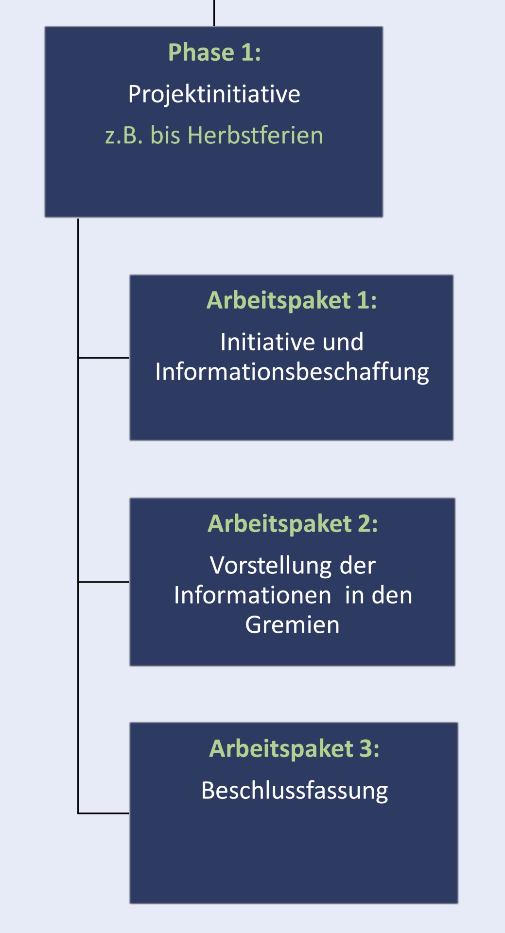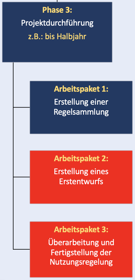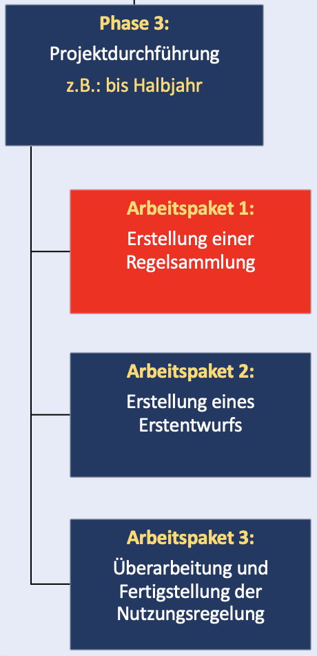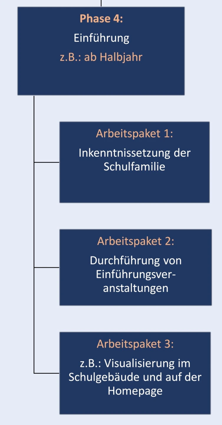 Hier empfiehlt es sich, vom Ende her zu planen, also zunächst einen Termin zur Einführung der neuen schuleigenen Regelungen festzulegen (z. B. zum Schulhalbjahr). Ausgehend vom Endpunkt werden dann die Projektphasen, Meilensteine, Arbeitspakete und Einzelarbeiten geplant. Ein besonderes Augenmerk gilt Arbeitspaketen, die zeitlich aufeinander aufbauen. Beispielsweise kann die Gewichtung von Regeln innerhalb einer Regelsammlung erst erfolgen, nachdem das Schulforum über diese Frage beraten hat und die im Schulforum vertretenen Gremien im Vorfeld ausreichend Zeit hatten, sich mit den Vorschlägen auseinanderzusetzen.