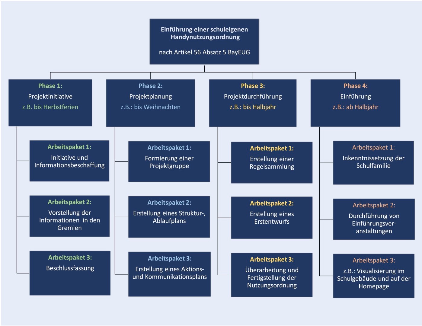 Medienerzieherische Projekte, Lehrerfortbildungen und Informationsveranstaltungen für Eltern sollten die Einführung der schuleigenen Regelung zur privaten Nutzung digitaler Endgeräte begleiten.