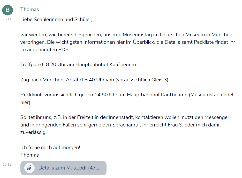 Vor einer Exkursion ins Deutsche Museum erstellt die Lehrkraft im ByCS-Messenger einen eigenen Raum für die Lerngruppe. Hier werden vorab Informationen zu Treffpunkt, Uhrzeiten und benötigten Materialien kommuniziert. Eine digitale Checkliste wird als PDF-Datei angehängt und ist damit jederzeit von den Schülerinnen und Schülern auffind- und abrufbar.