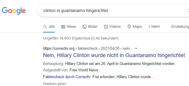 Entsprechend wird dann z. B. bei Google oder Facebook der Beitrag mit einem Zusatz versehen. Die Plattformen stellen diese Artikel dann heraus, um der Richtigstellung mehr Reichweite einzuräumen.