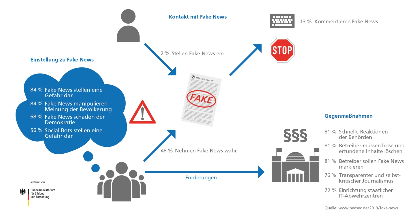 Reuter, C., Hartwig, K., Kirchner, J., & Schlegel, N. (2019). Fake News Perception in Germany: A Representative Study of People’s Attitudes and Approaches to Counteract Disinformation. In Proceedings of the International Conference on Wirtschaftsinformatik. Siegen, Germany. In Url: https://peasec.de/wp-content/uploads/2019/01/2019_ReuterHaKiSc_FakeNewsPerceptionGermany_WI.pdf. [abgerufen am: 24.04.2021]