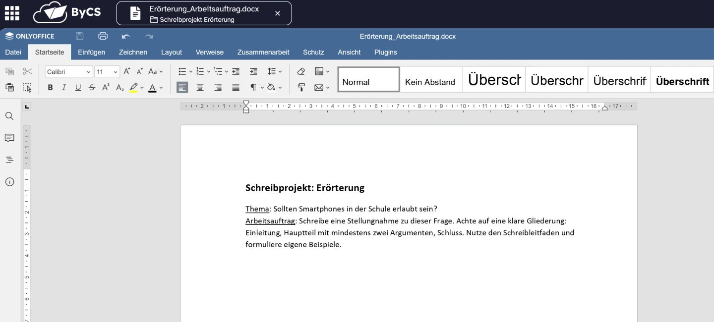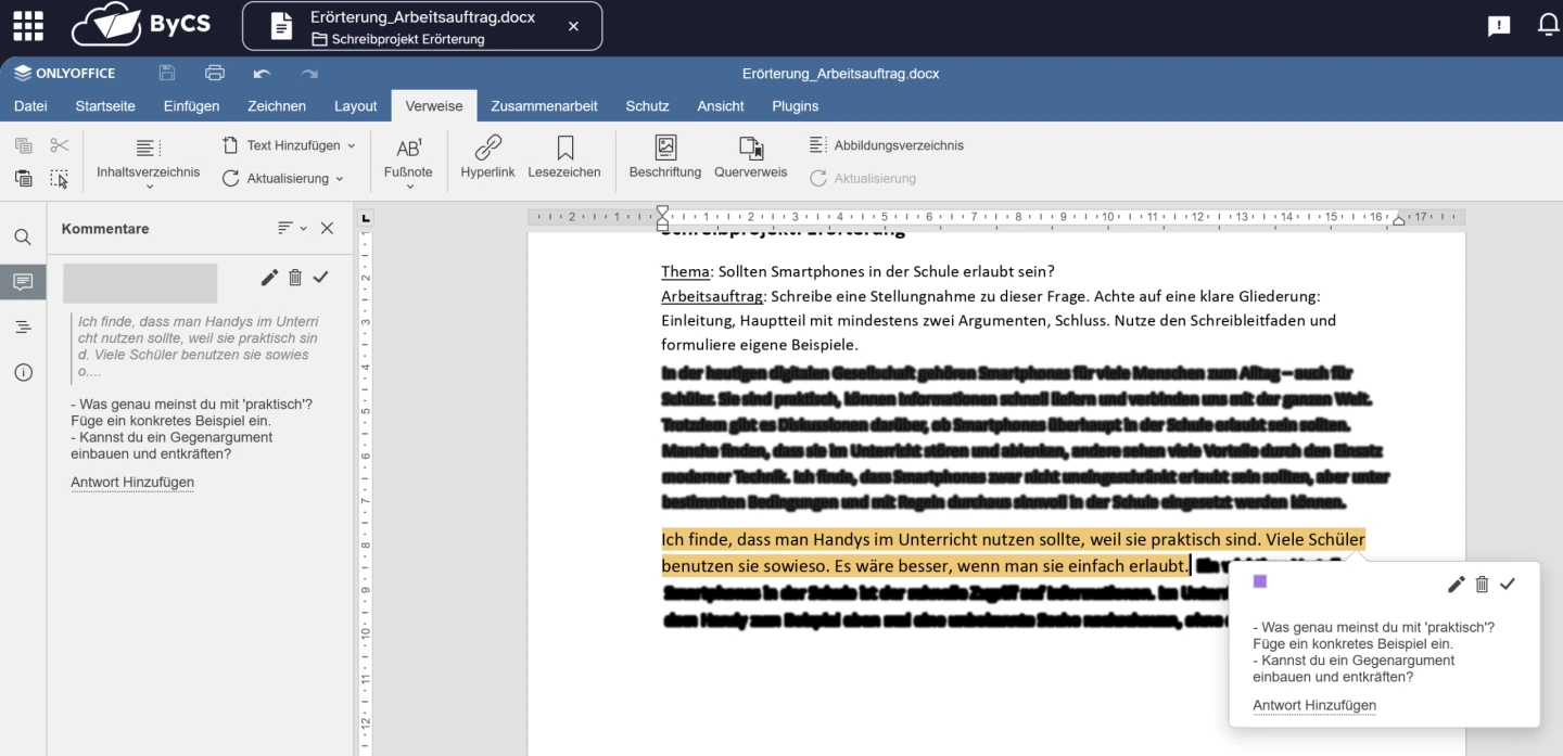 ByCS-Drive unterstützt diesen Prozess einfach und transparent: Texte oder Produkte werden in der Cloud geteilt, die Rückmeldung erfolgt direkt im Dokument mithilfe der Kommentarfunktion. Die Versionierung erlaubt, frühere Fassungen einzusehen, und die Lehrkraft behält den Überblick über den Verlauf..