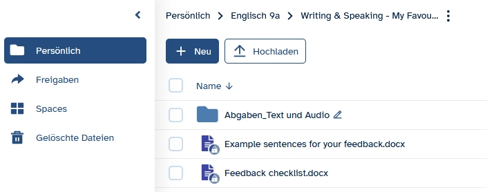 Die Lehrkraft legt in ByCS-Drive einen gemeinsamen Ordner oder Space an (z. B. „Writing & Speaking – My Favourite Place“) und formuliert eine klare Aufgabenstellung: Describe your favourite place in a text (about 250 words) and record your text.