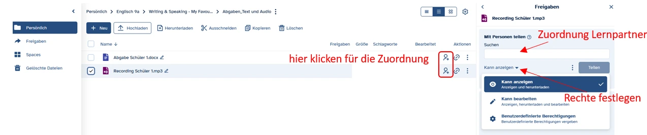 Peer-Feedback: Die Texte und Sprachaufnahmen werden von der Lehrkraft einem Feedback-Partner zugewiesen. Dazu verteilt die Lehrkraft entsprechende Freigaberechte. Die schriftliche Rückmeldung durch die Mitschülerinnen und Mitschülert erfolgt direkt im Text mithilfe der Kommentarfunktion.