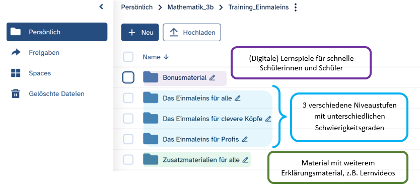 Die Lehrkraft legt in ByCS-Drive für verschiedene Niveaustufen jeweils einen eigenen Ordner an. Zusätzlich können weitere Ordner für Zusatzmaterialien (z. B. Lernvideos) oder Bonusangebote (wie Lernspiele für schnelle Schülerinnen und Schüler) eingerichtet werden. Je nach Zielsetzung, Ausstattung der Schule und Klassensituation werden in den Ordnern entweder Arbeitsblätter zum Übertragen ins Heft oder interaktive digitale Übungen bereitgestellt.