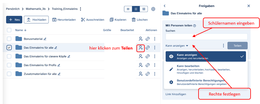 Zugriffsrechte gezielt vergeben: Lernende sollten nur die Ordner sehen, die für sie bestimmt sind – das fördert die Konzentration und verhindert unnötige Verwirrung.