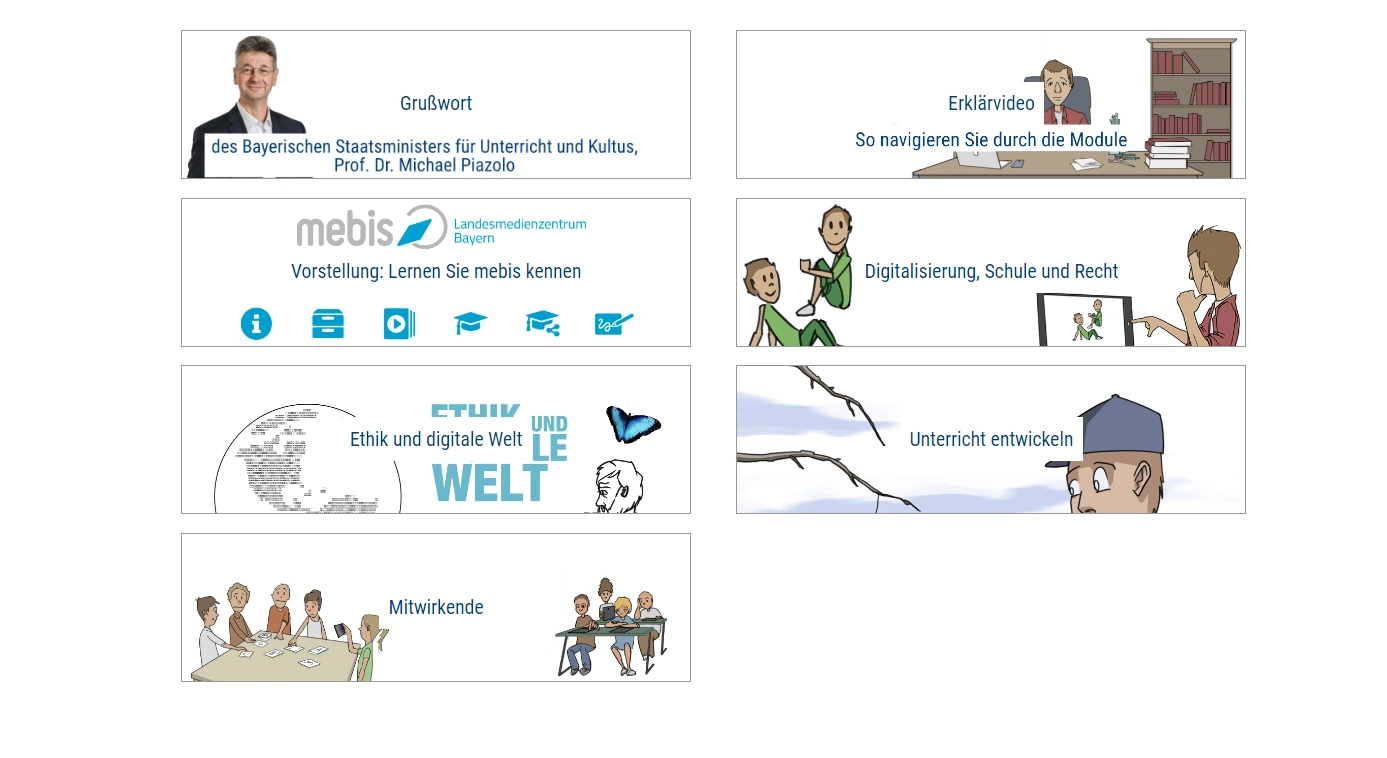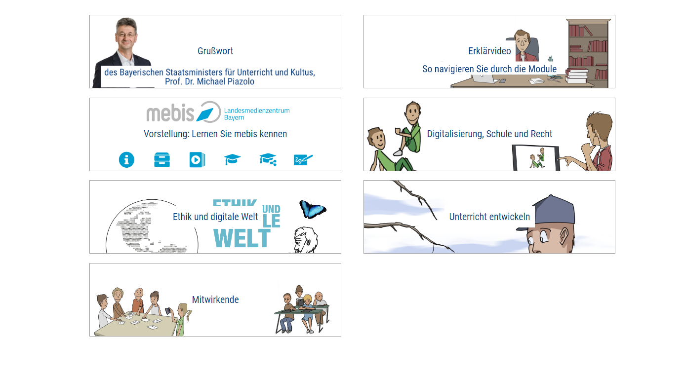 Ein wichtiges Element der flächenwirksamen Fortbildungsoffensive sind insgesamt fünf onlinegestützte Selbstlernkurse (drei Basismodule, zwei Vertiefungsmodule) zur Fortbildung aller Lehrkräfte in Bayern.