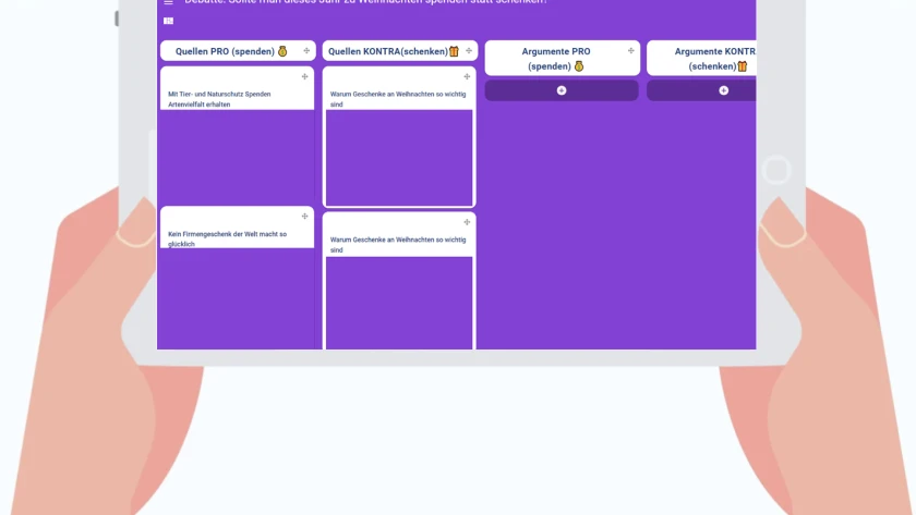 Die Lernenden sammeln gemeinsam passende Quellen, entwickeln kooperativ Argumente und setzen sich kritisch mit anderen Positionen auseinander