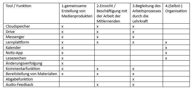 Die folgende Tabelle stellt exemplarisch einige ausgewählte digitalen Werkzeuge und deren Funktionen, die für die o.g. Bereiche eingesetzt werden können.