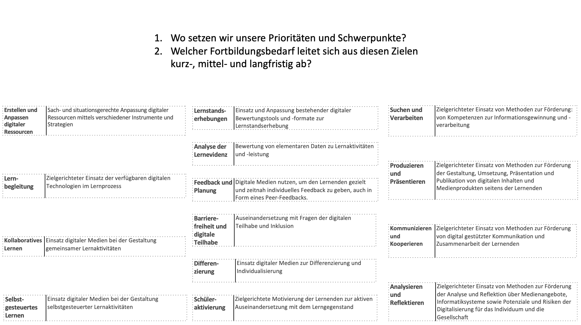 Eine individuelle Schwerpunktsetzung bei der Unterrichtsentwicklung kann den Schulen anschließend helfen, weitere Fortbildungsinhalte so zu definieren, dass die Lehrkräfte die für das angestrebte Unterrichtskonzept erforderlichen Kompetenzen auf- und ausbauen können. Das Kollegium sollte bei der unterrichtlichen Zielsetzung miteinbezogen werden. Dabei sind folgenden Fragestellungen relevant: