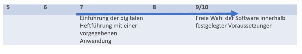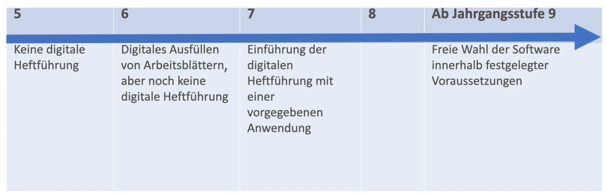 „In den Klassen M7 und M8 wird im Fach Englisch nur noch ein digitales Heft geführt, sowie ein analoger Schnellhefter für zusätzliche Merkblätter oder Wortschatzarbeit. Da auch unterschiedliche Phasen des Englischunterrichts mit dem digitalen Heft organisiert werden, dient das digitale Heft hier nicht nur zum Notieren von Merkhefteinträgen, sondern fungiert auch als Zwischenstelle von Aufgaben aus dem Schulbuch und interaktiven Anwendungen. In anderen Fächern werden analoge Hefte geführt, sowie digitale Hefte zur Unterstützung. Die Lehrkräfte werden regelmäßig in schulinternen Fortbildungen zum Unterricht mit digitalen Heften geschult und es wird ihnen dazu angeraten, es den Lernenden auch freizulassen, ob ein analoges oder digitales Heft geführt werden möchte.“