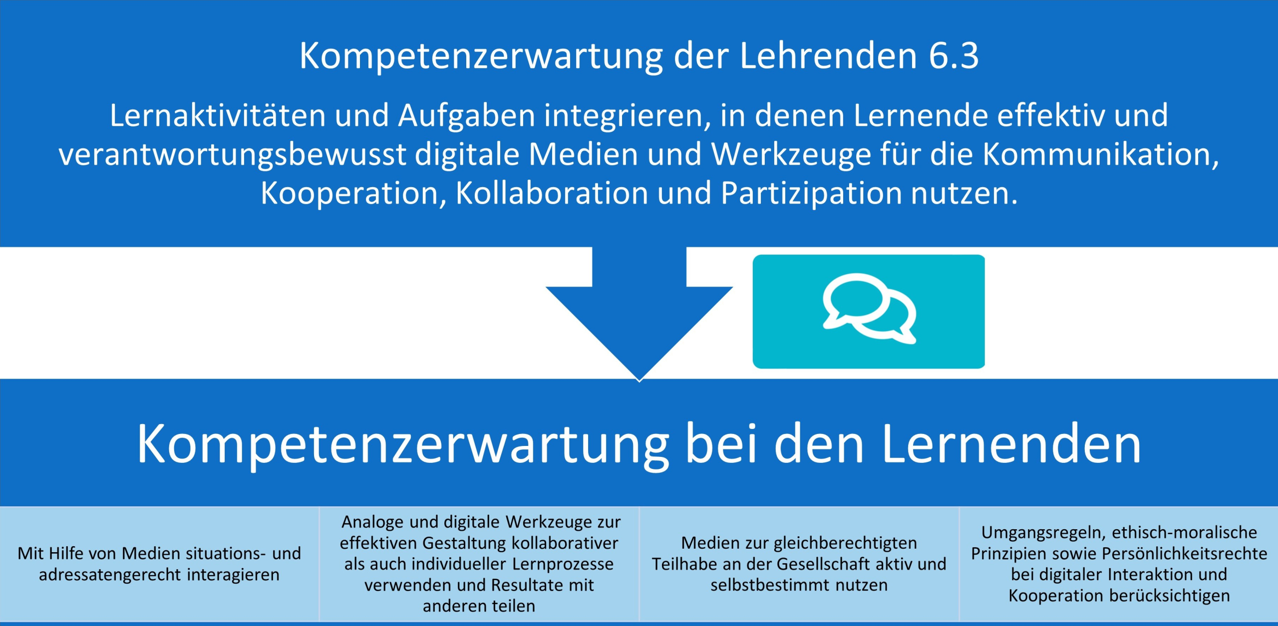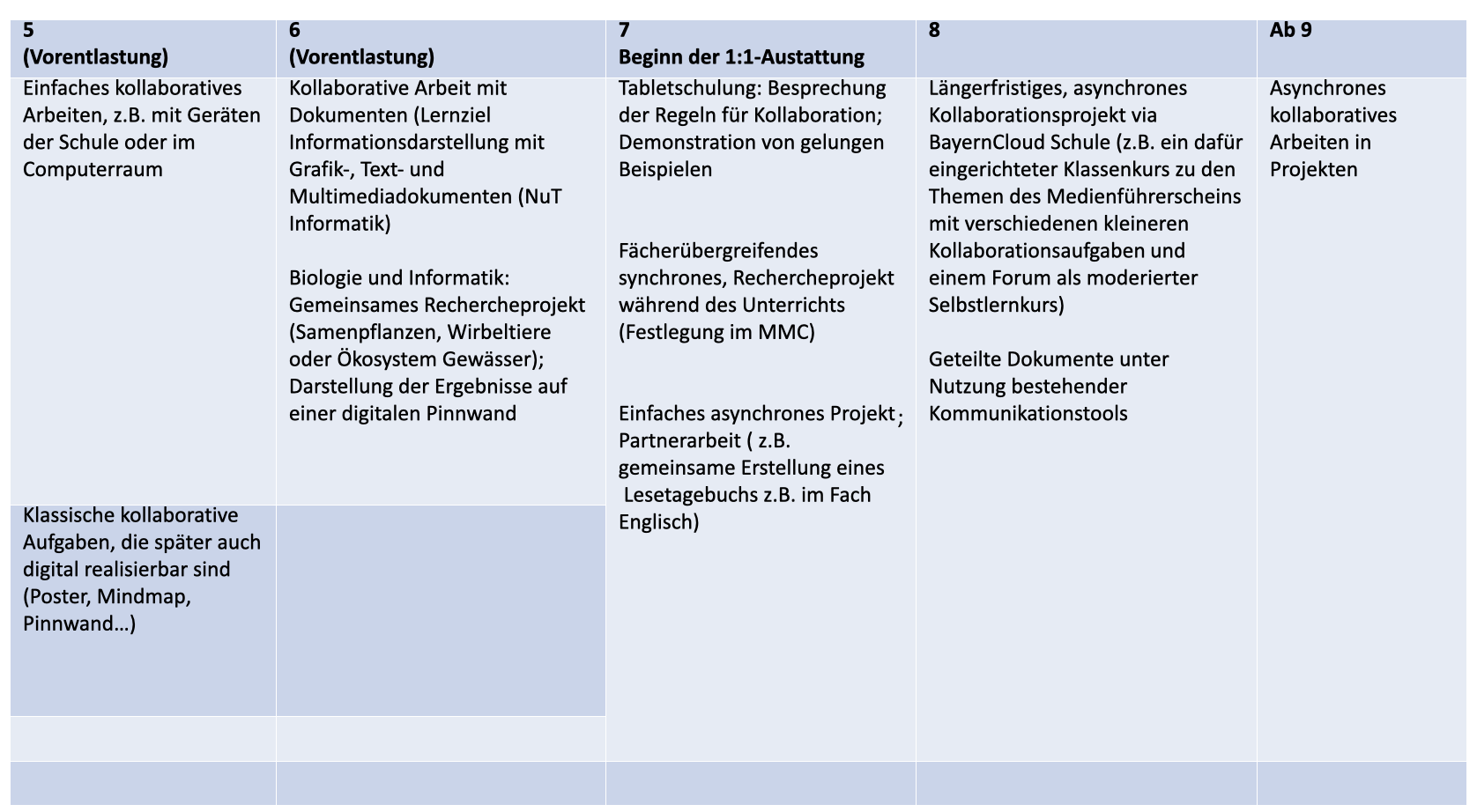 „Zahlreiche Anwendungen eröffnen neue Wege der Kollaboration und Kommunikation im Unterrichtsalltag. Jede bzw. jeder einzelne Lernende, egal ob im Rahmen einer Gruppen- oder in Einzelarbeit, wird in die Lage versetzt, ihre oder seine Arbeitsergebnisse digital zu veröffentlichen, sich mit Lernpartnerinnen- und partnern auszutauschen sowie Ergebnisse zu überarbeiten und zu fixieren. Das Heranführen an diese kollaborative Arbeitsweise wird an unserer Schule auf folgende Weise umgesetzt:”