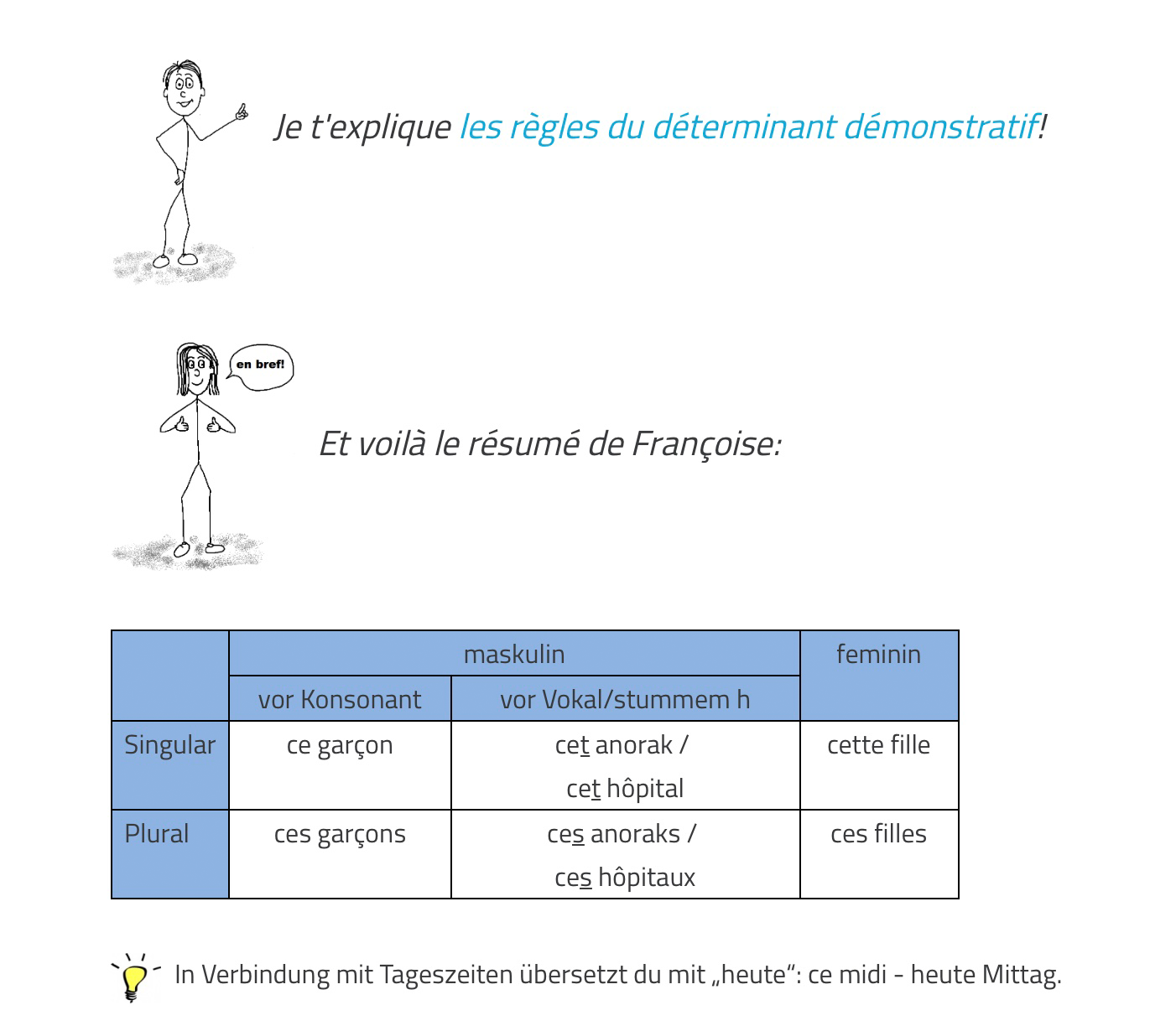Die Übungen sind so konzipiert, dass die Lernenden direkt und unmittelbar eine Rückmeldung erhalten. Bei einer falschen Lösung gibt es zusätzlich die Möglichkeit, in den Regelerklärungen „François et Françoise expliquent” selbstständig die notwendigen Hinweise zu finden, um die Übung bei den folgenden Wiederholungen richtig zu lösen.
