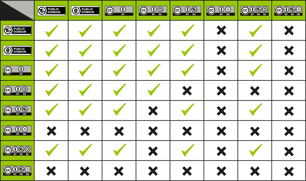 Weiterhin sind nicht alle CC-Lizenztypen miteinander verträglich. Folgende Aufstellung stellt die Kompatibilität der Lizenzen dar.