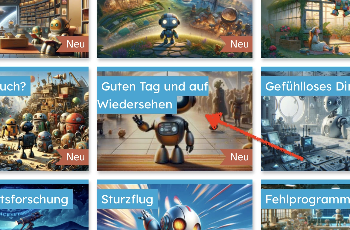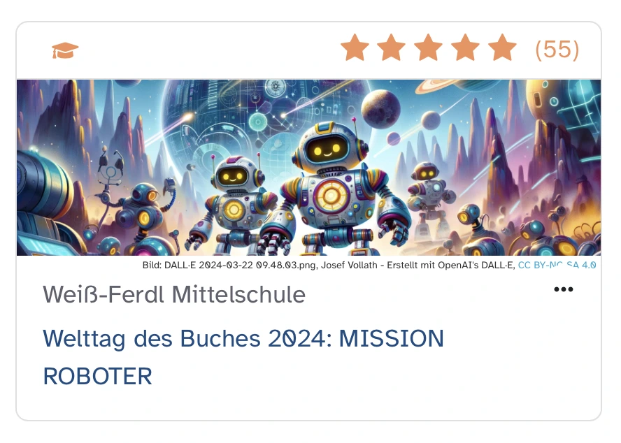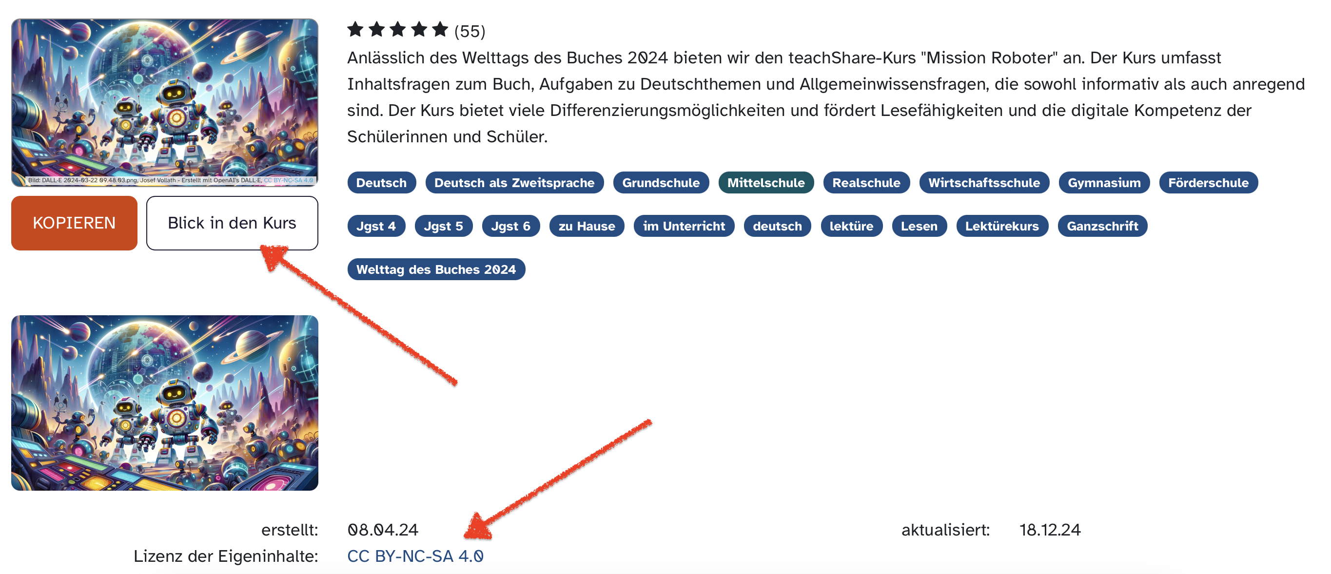 Suchen Sie sich einen Kurs aus, aus dem Sie den H5P- Inhalt kopieren möchten, zum Beispiel der Kurs zum Buch „MISSION ROBOTER”. Dieser wurde zum Welttag des Buches 2024 zur Verfügung gestellt: