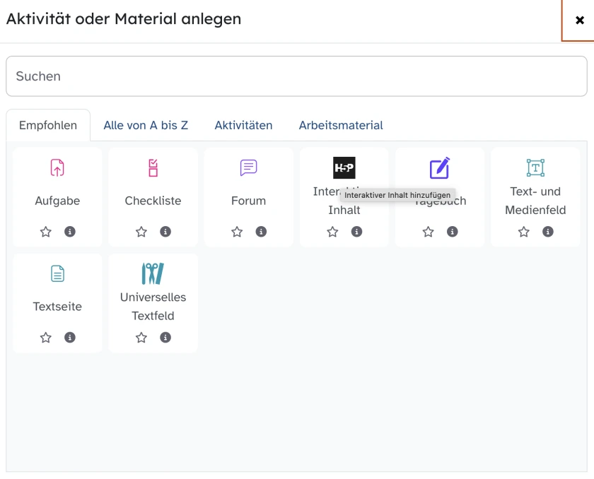 Nachdem Sie Ihren Kurs auf Bearbeitungsmodus umgestellt haben, wählen Sie „Aktivität oder Material” anlegen aus, um anschließend einen Interaktiven Inhalt einzufügen.