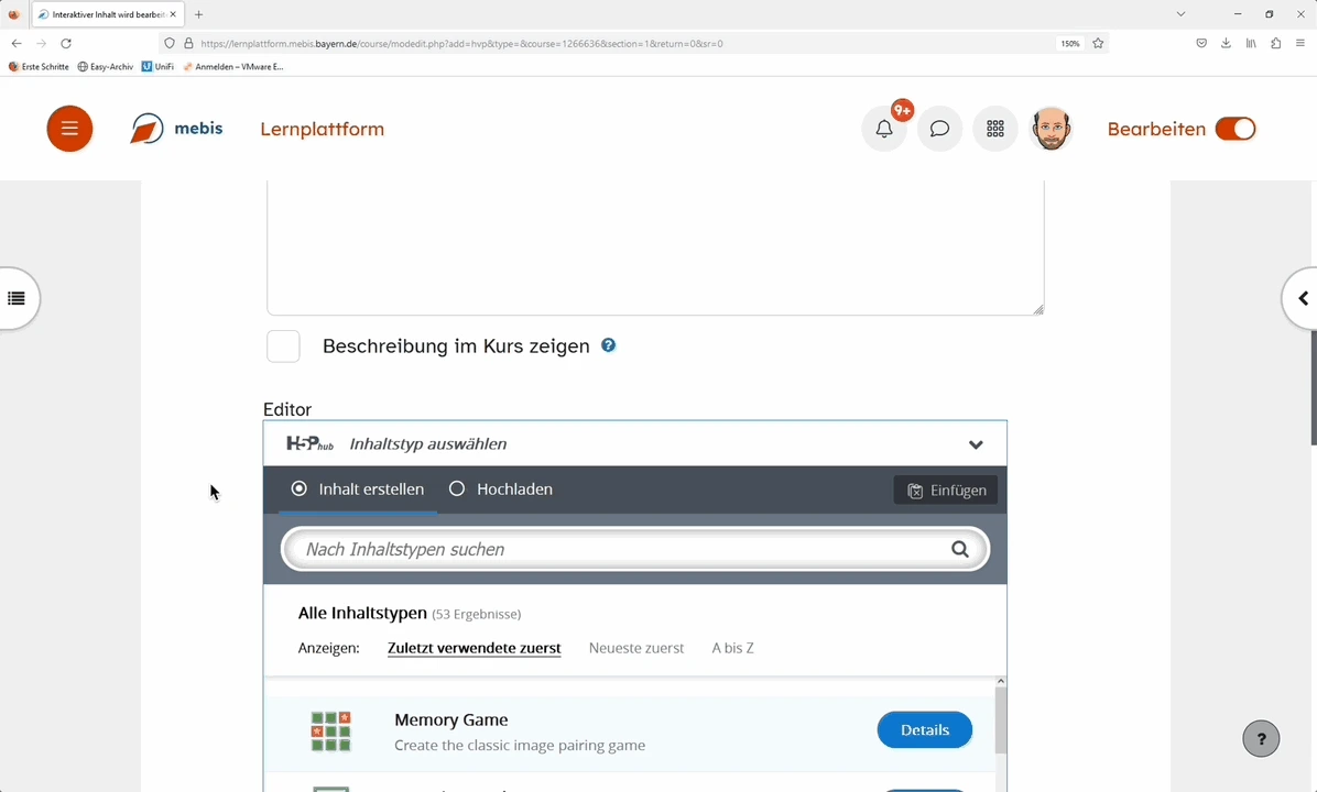 Mit „Benutzen” wird diese in Ihren Kurs geladen. Damit das Inhaltselement endgültig in Ihren Kurs geladen wird, speichern Sie den Kursinhalt