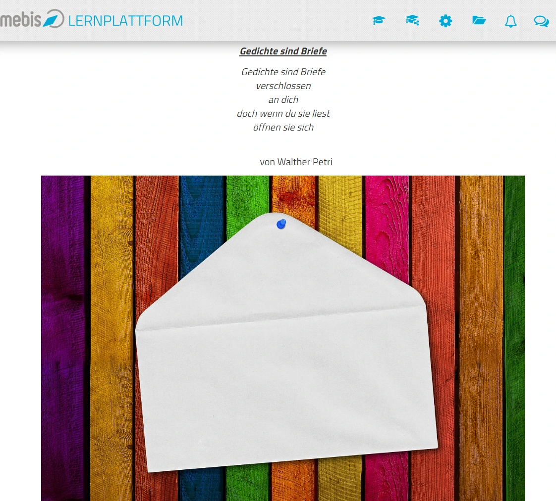 Der mebis-Kurs „Gedichtewerkstatt“ regt zur Auseinandersetzung mit Gedichten an. Anhand verschiedener Aufgaben zu unterschiedlichen Gedichten, lernen die Schülerinnen und Schüler Gedichte verschiedener Autorinnen und Autoren kennen, suchen Reimwörter, dichten eigene Strophen und beschäftigen sich mit Kriterien für einen guten Gedichtvortrag. Bei einigen Gedichten gibt es Anregungen zu weiterführenden Gesprächen (z.B. bei „Warum sich Raben streiten“).