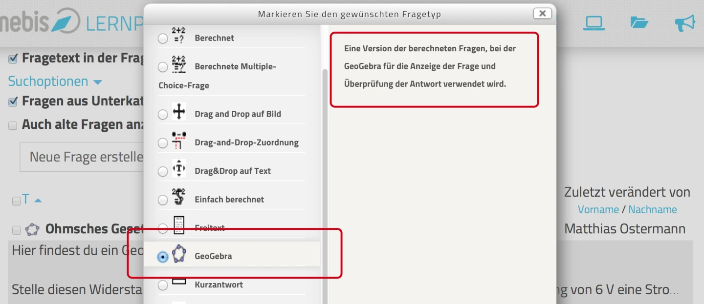 Klicken Sie in ihrer Fragesammlung oder bei einem bereits erstellen Test wie gewohnt die Option „Neue Frage erstellen”. Wählen Sie „GeoGebra” als Fragetyp aus.