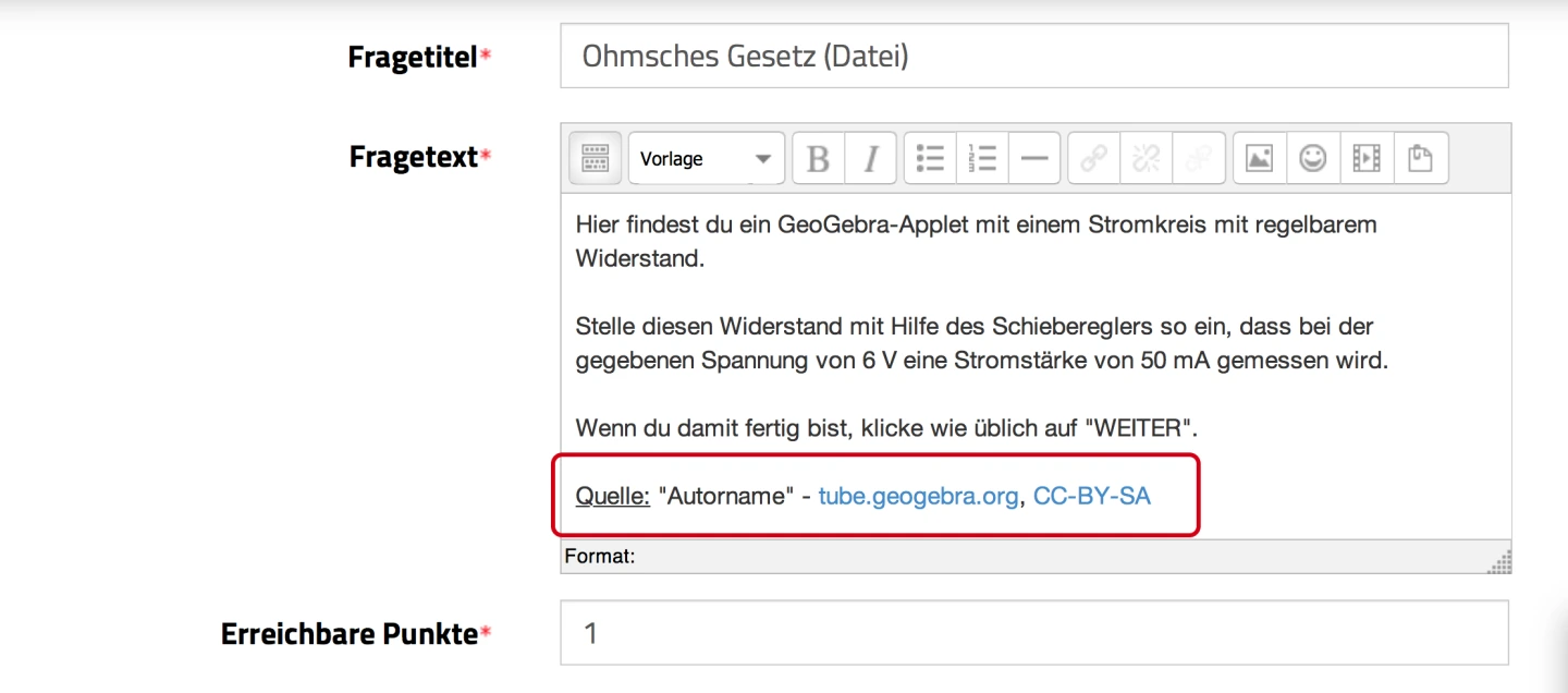 Da mit diesem Fragetyp fremder Inhalt in die mebis-Lernplattform eingebettet wird, sollten Sie hier - neben den üblichen Angaben wie Fragetitel, -text und erreichbaren Punkten - auch den Urheber des verwendeten GeoGebra-Applets sowie die Lizenz, unter der das Applet steht, angeben. Auf GeoGebraTube veröffentlichte Applets stehen unter der Creative Commons-Lizenz CC-BY-SA. Bei Verwendung eigener Applets sollten Sie das ebenfalls angeben.