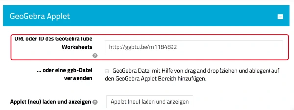 Sie haben auf GeoGebraTube ein GeoGebra-Applet gefunden, das Ihnen zusagt. Kopieren Sie die URL in das hierfür vorgesehene Feld. Klicken Sie anschließend für die Einbettung auf „Applet (neu) laden und anzeigen”.