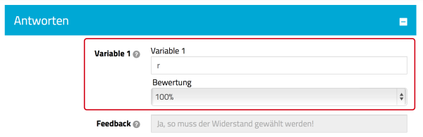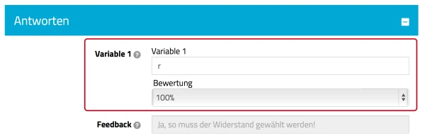 Unter „Antworten” werden die Wahrheitswerte aufgelistet, die im GeoGebra-Applet definiert sind. Sie wählen nun die Bewertung, die vergeben wird, wenn dieser Wahrheitswert mit „JA” übergeben wird. Ein entsprechendes Feedback für diesen Fall kann im GeoGebra-Applet festgelegt werden.