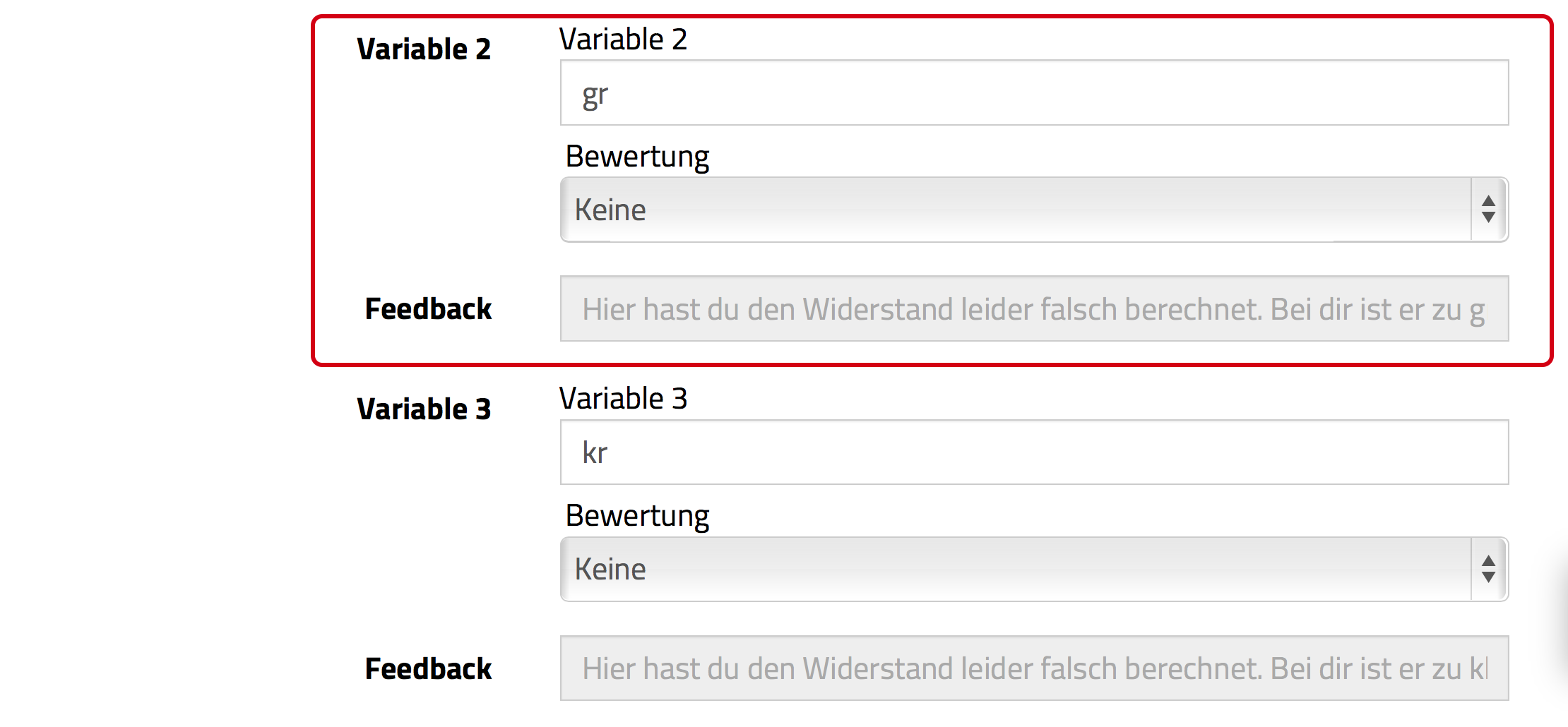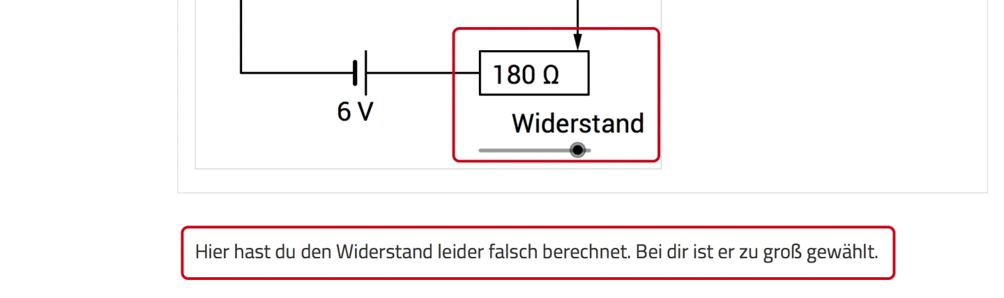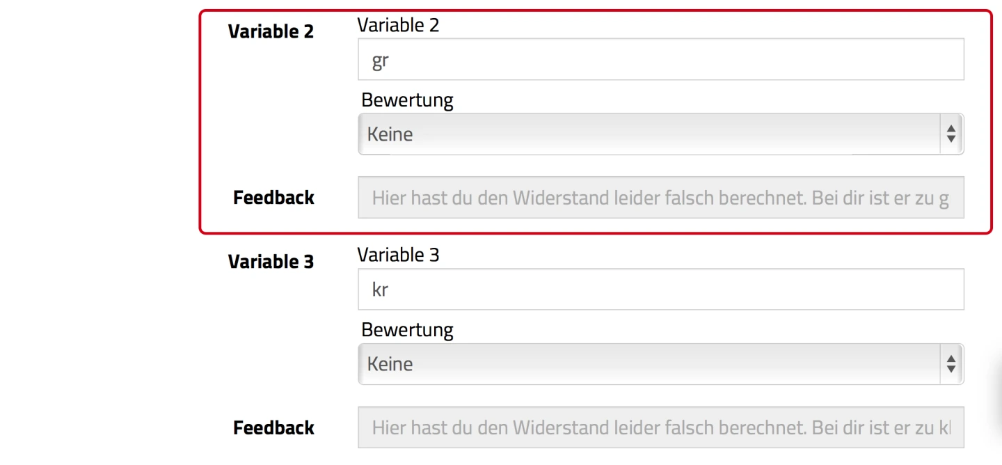 Im unteren Bild sehen Sie Feedback für einen Fall, in dem die Schülerin oder der Schüler die Frage nicht korrekt beantwortet hat. Hier wurden zum „JA”-Fall zwei weitere Variablen definiert, die die Fälle „größer als gesuchter Wert” und „kleiner als gesuchter Wert” abdecken.
