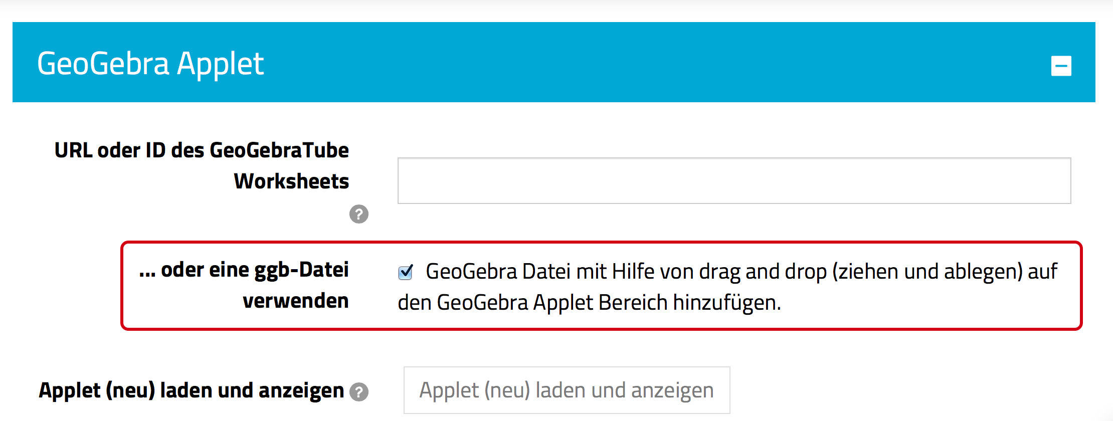 Sie haben ein GeoGebra-Applet selbst erstellt oder ein fremdes liegt Ihnen als .ggb-Datei vor. Ziehen Sie die Datei per Drag&Drop in den Bereich unter dem blauen Balken mit der Aufschrift „GeoGebra Applet”, die Datei wird automatisch eingebettet.