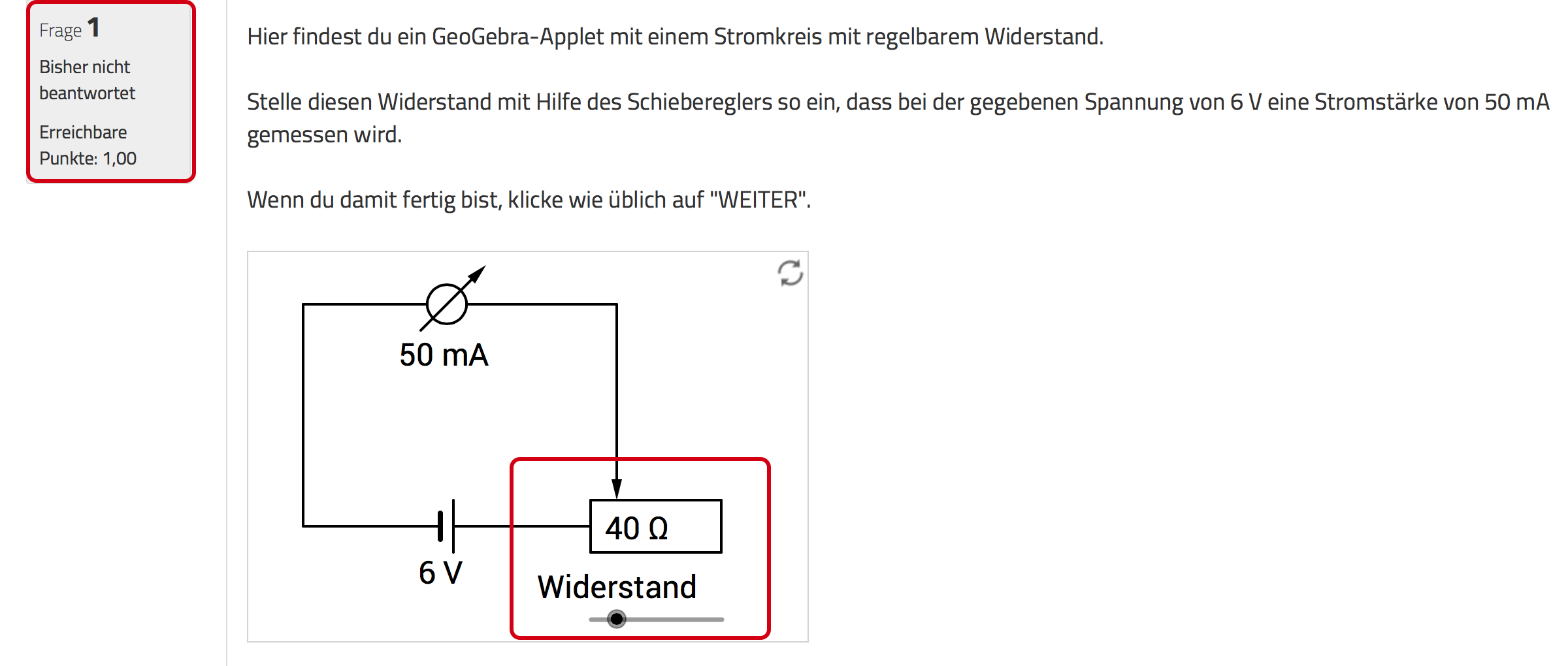 Bei der Testdurchführung bearbeitet die Schülerin oder der Schüler das GeoGebra-Applet wie im Fragetext angegeben. Wie üblich wird die Frage mit „Weiter” als beantwortet markiert und zur folgenden Frage weitergeleitet. Im Hintergrund übergibt das GeoGebra-Applet die beschriebenen Wahrheitswerte zur Auswertung an die Testumgebung.