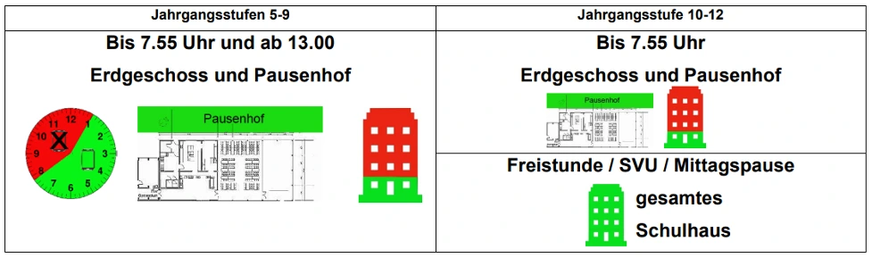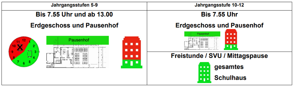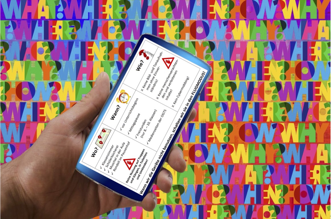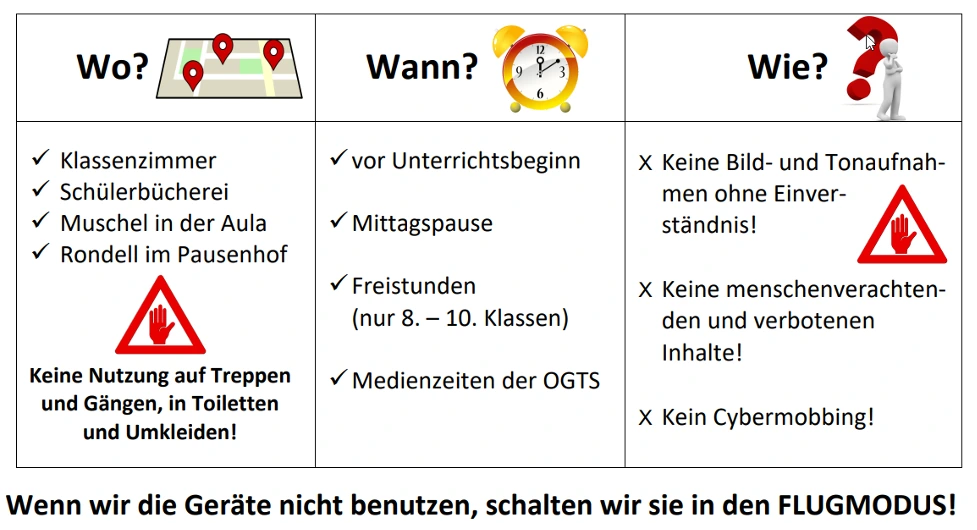 Je nach Schulart und Gegebenheiten vor Ort kann es sinnvoll sein, die Regelungen räumlich und zeitlich zu staffeln und dementsprechend nur bestimmte Bereiche und Zeiträume für die Handynutzung festzulegen. Alternativ dazu, jedoch ggf. weniger restriktiv, könnten auch Bereiche und Zeiträume festgelegt werden, in welchen die Handynutzung nicht gestattet ist.
